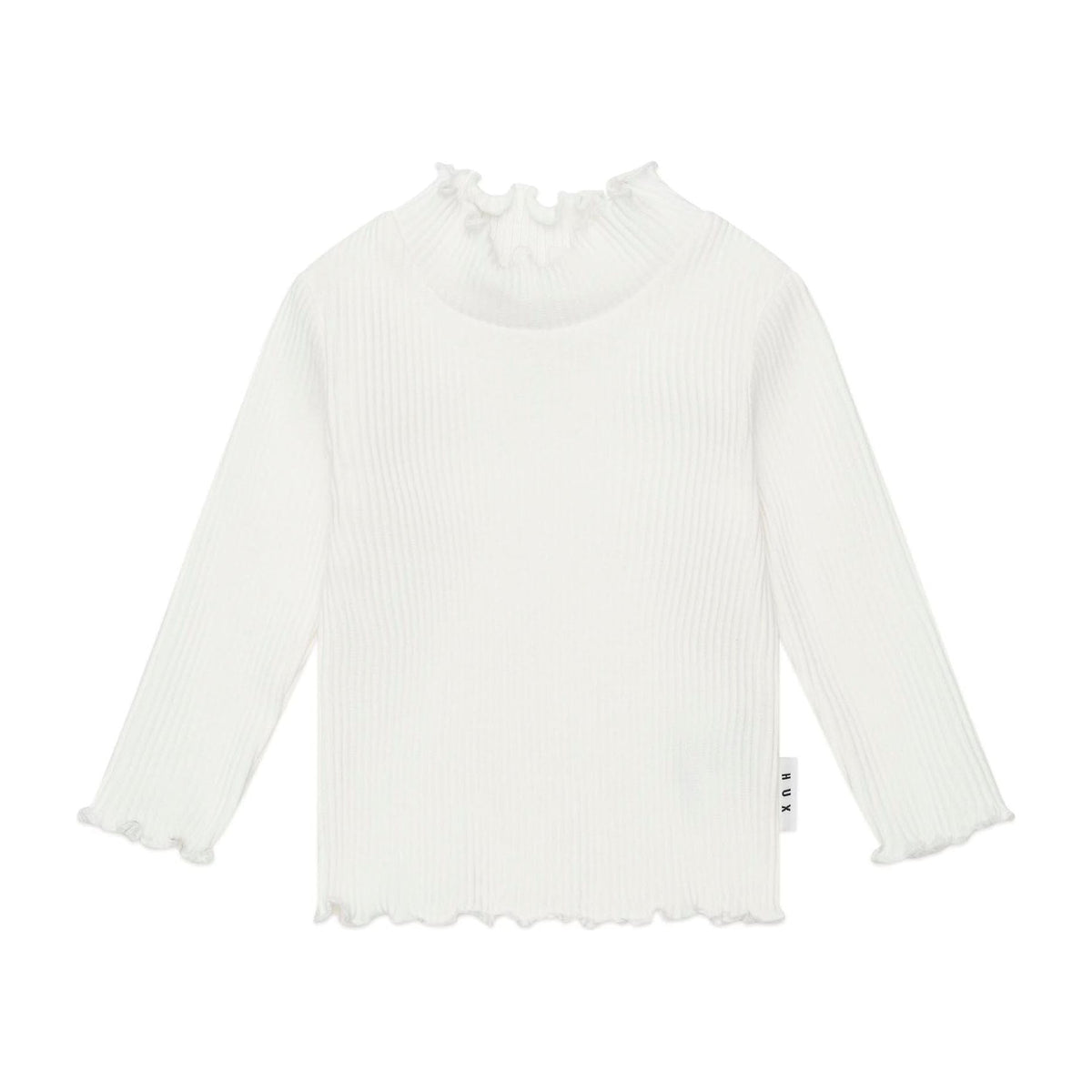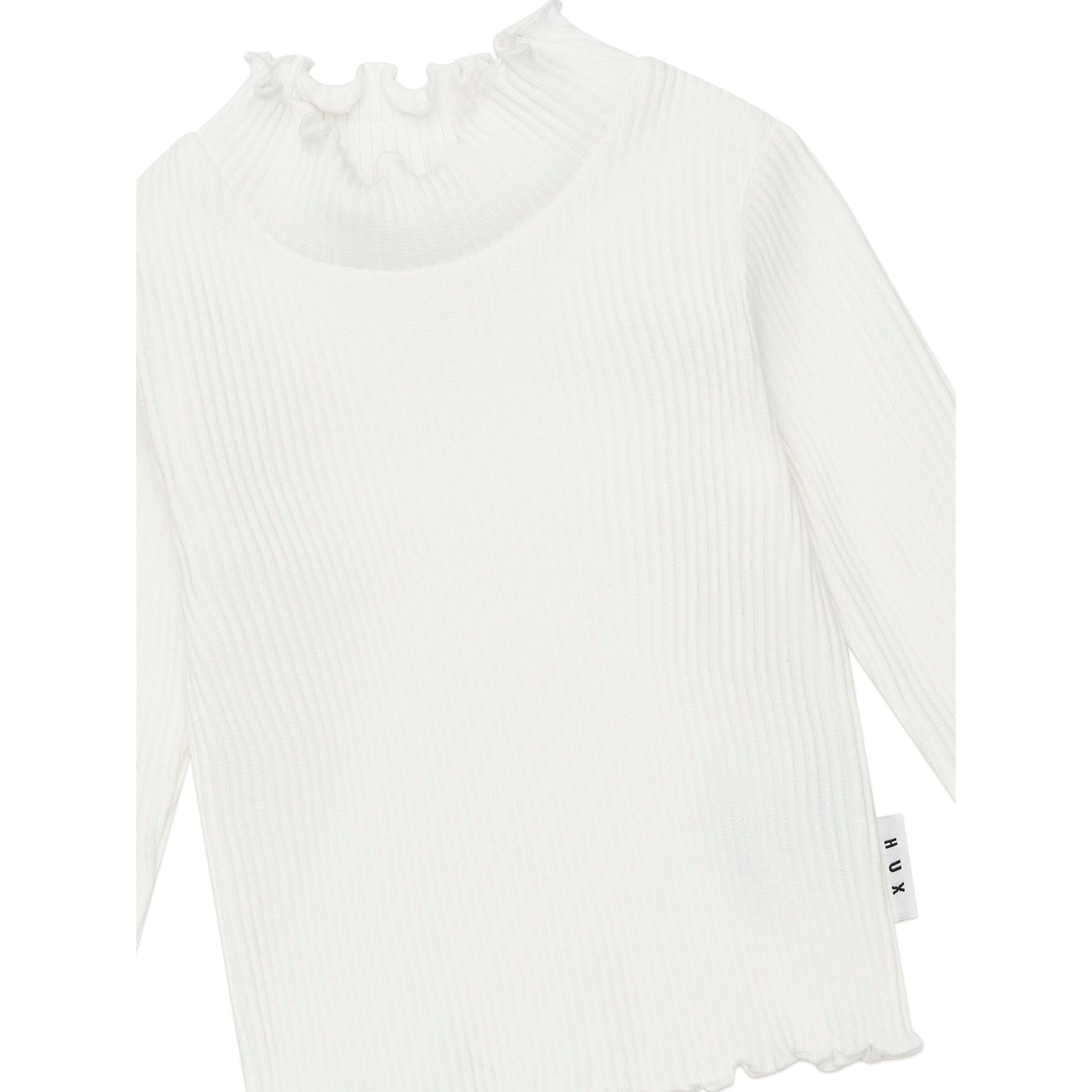 A versatile layering piece in milky white. This long-sleeved top is made from extra thick ribbed cotton to keep little bodies warm and features a sweet lettuce edge detail to complete the look. A true wardrobe essential.