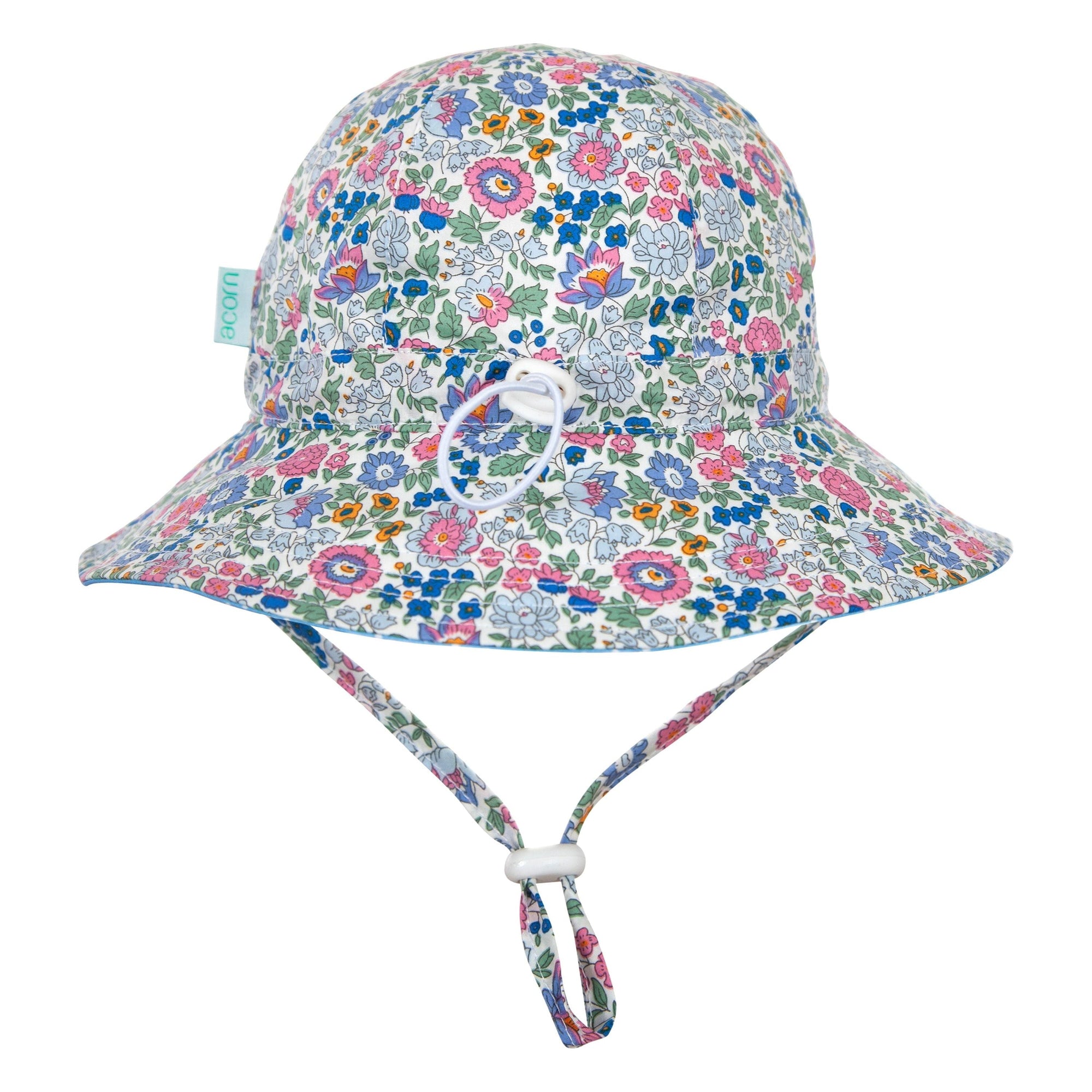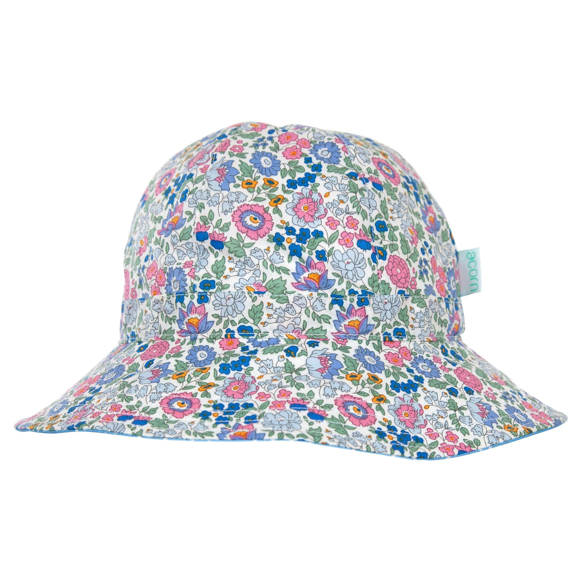 Wide brim sunhat with a pink and purple floral print on the outside and a blue and white polka dot print on the inner brim. Elasticated toggle around the head for the perfect fit. Cord and toggle under the chin to keep the hat in place. Wide brim (Measures for each size S: 6cm, M: 6.5cm, L: 7cm, XL: 7.5cm). Material: 100% Cotton including lining. Tested and certified as providing UPF50+ sun protection.