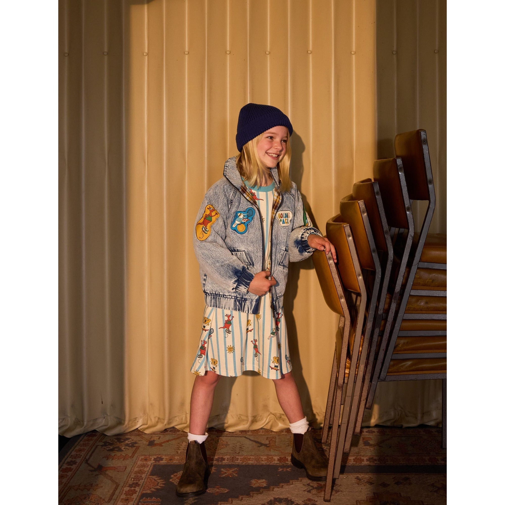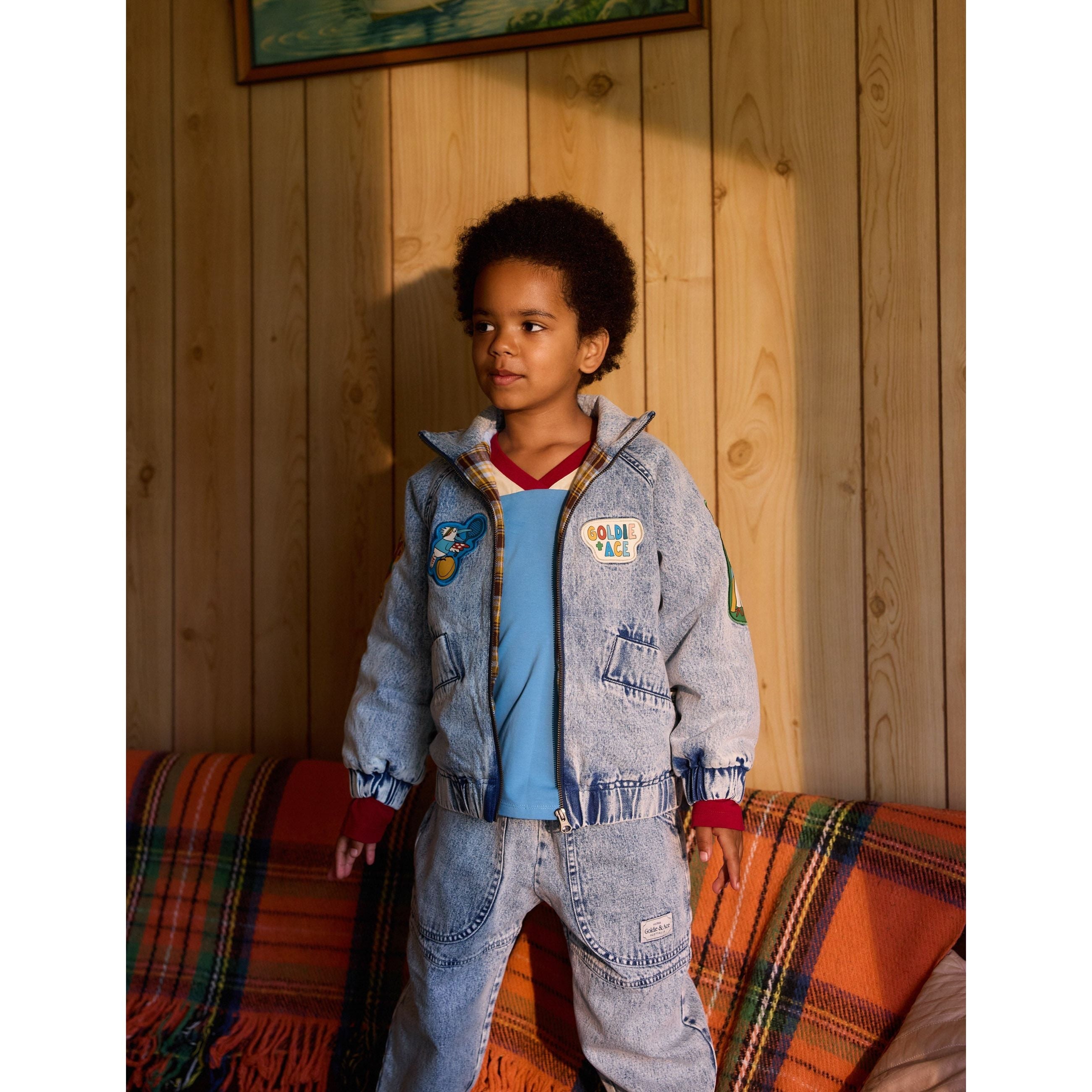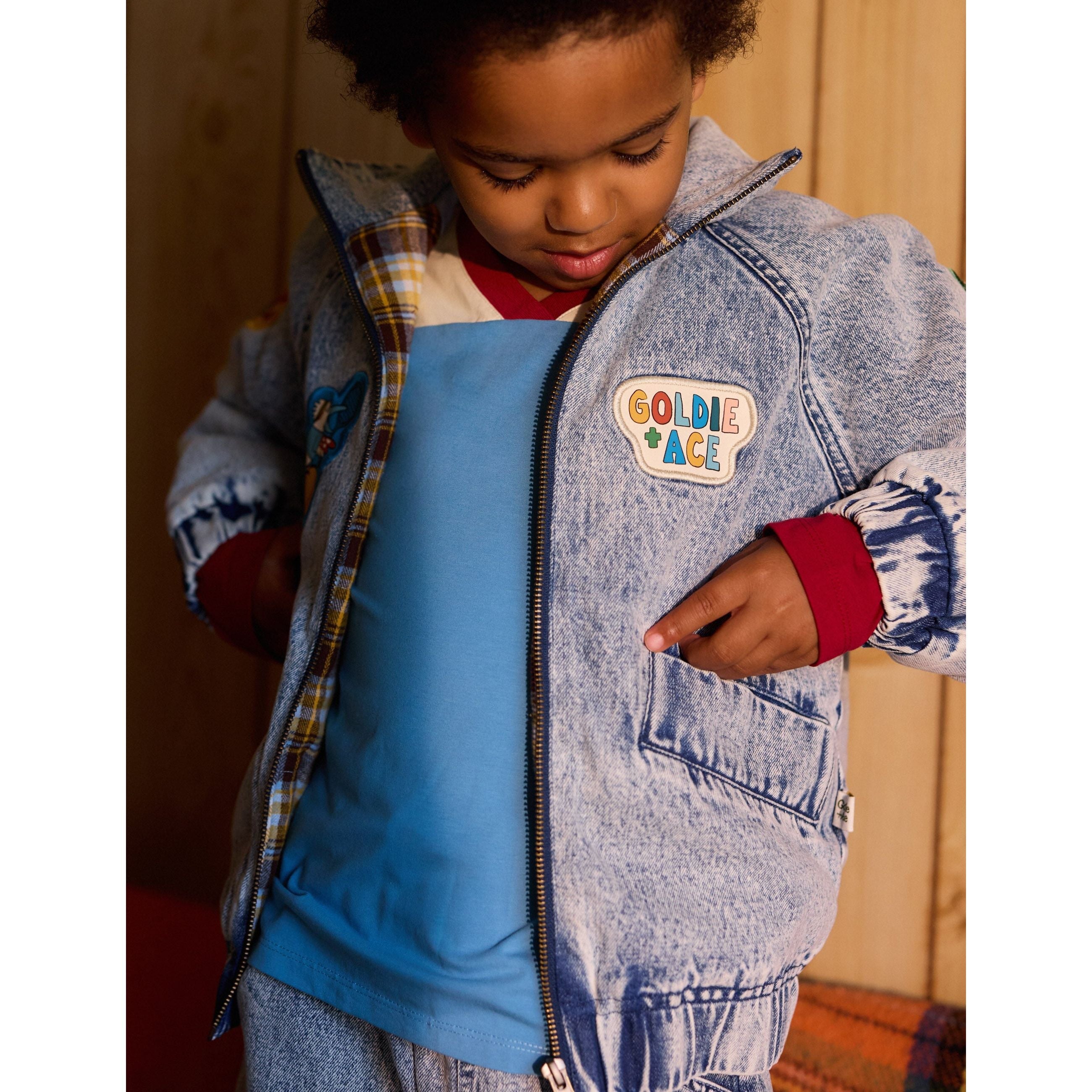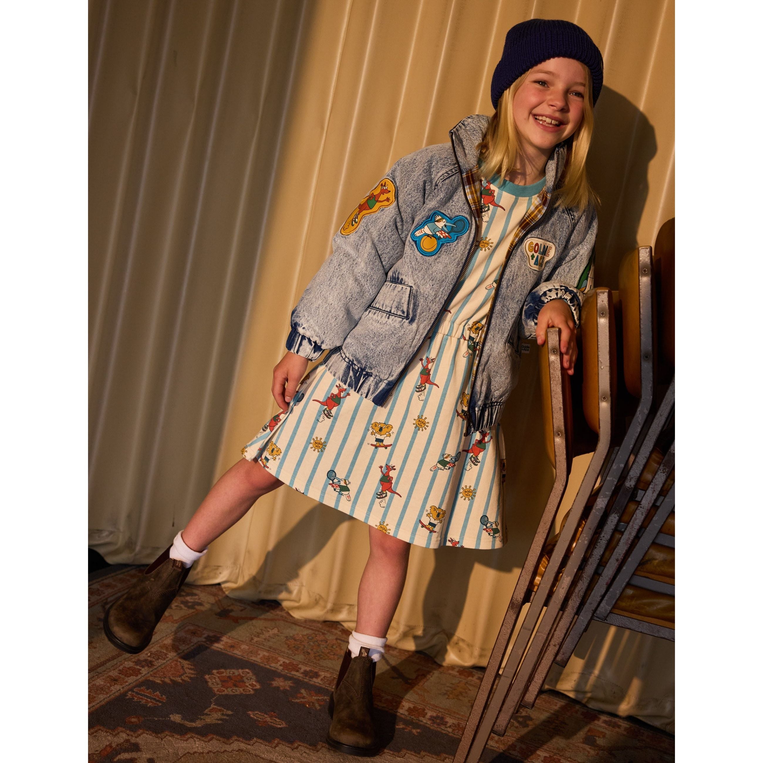 True to size. Size up for more room to layer. Features hand drawn Australian animal woven badges all over. Functional pockets and soft brushed cotton lining. A statement denim piece that pairs back with everything.