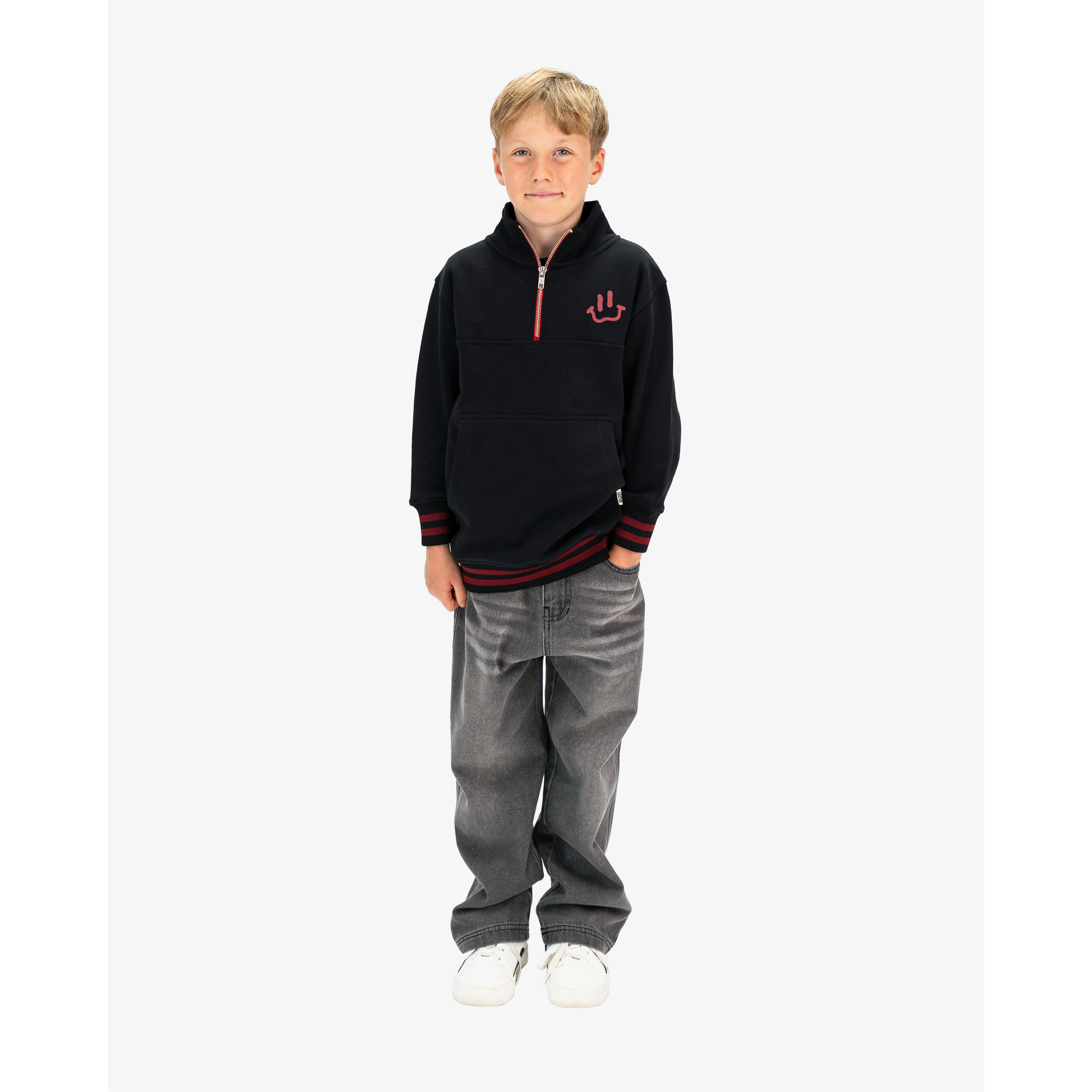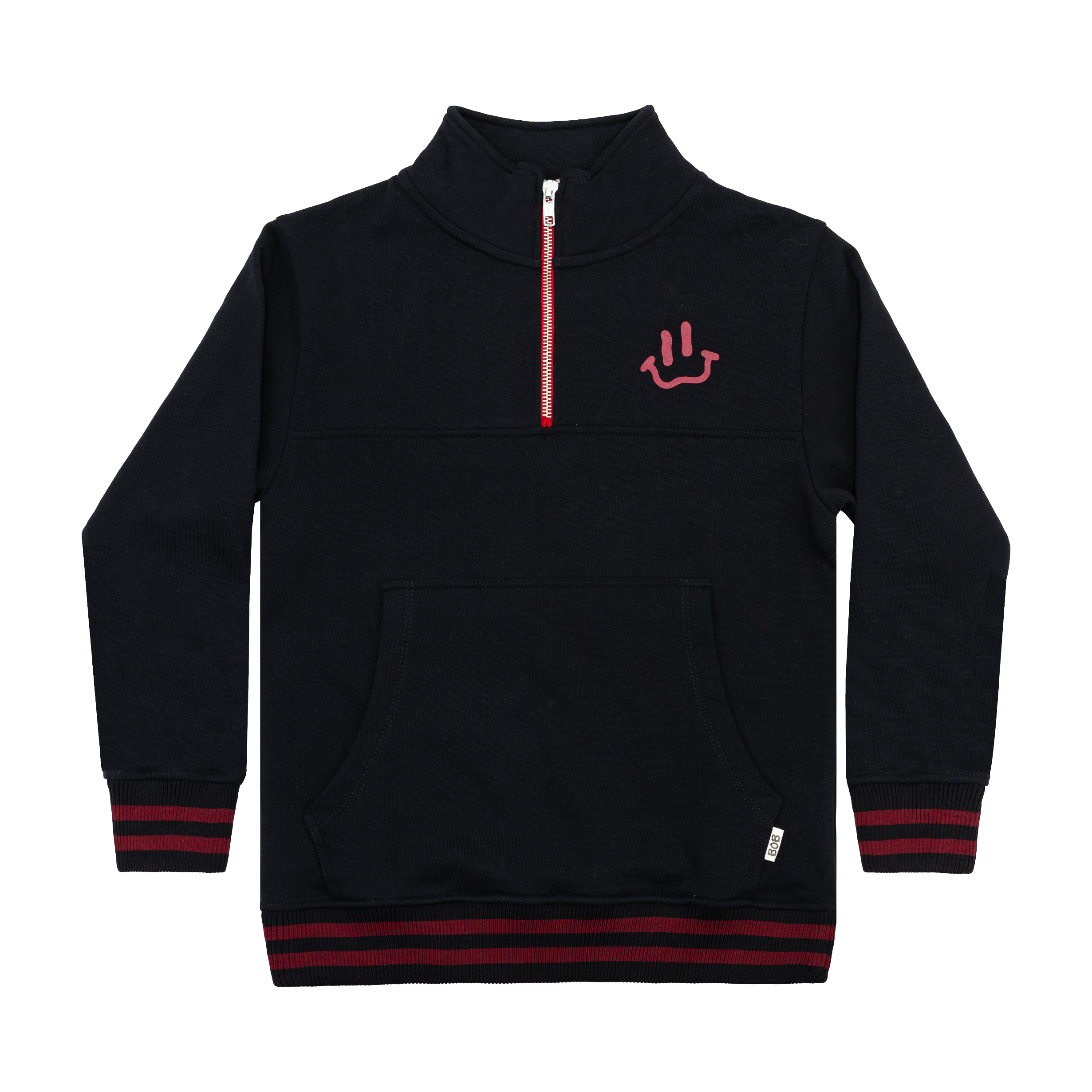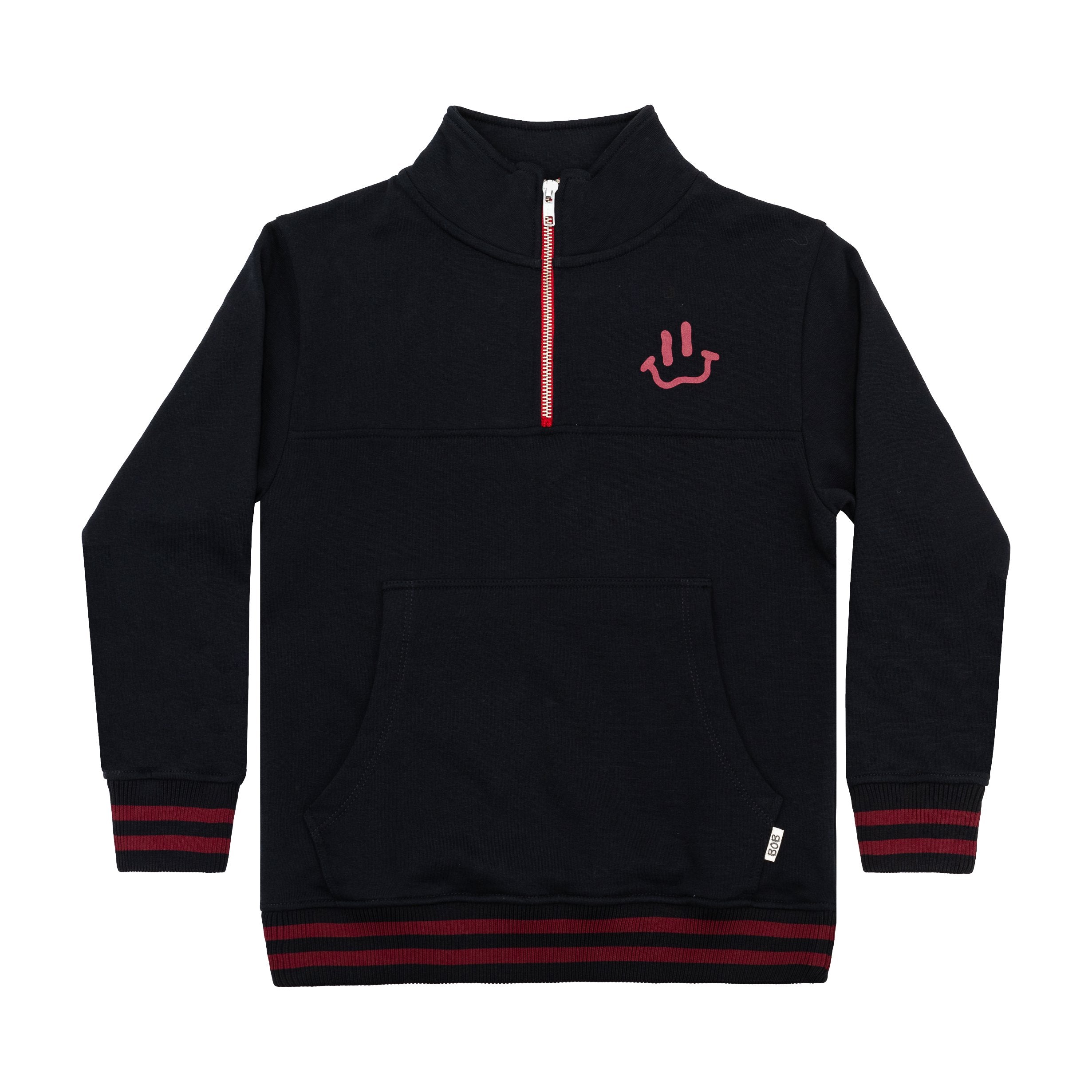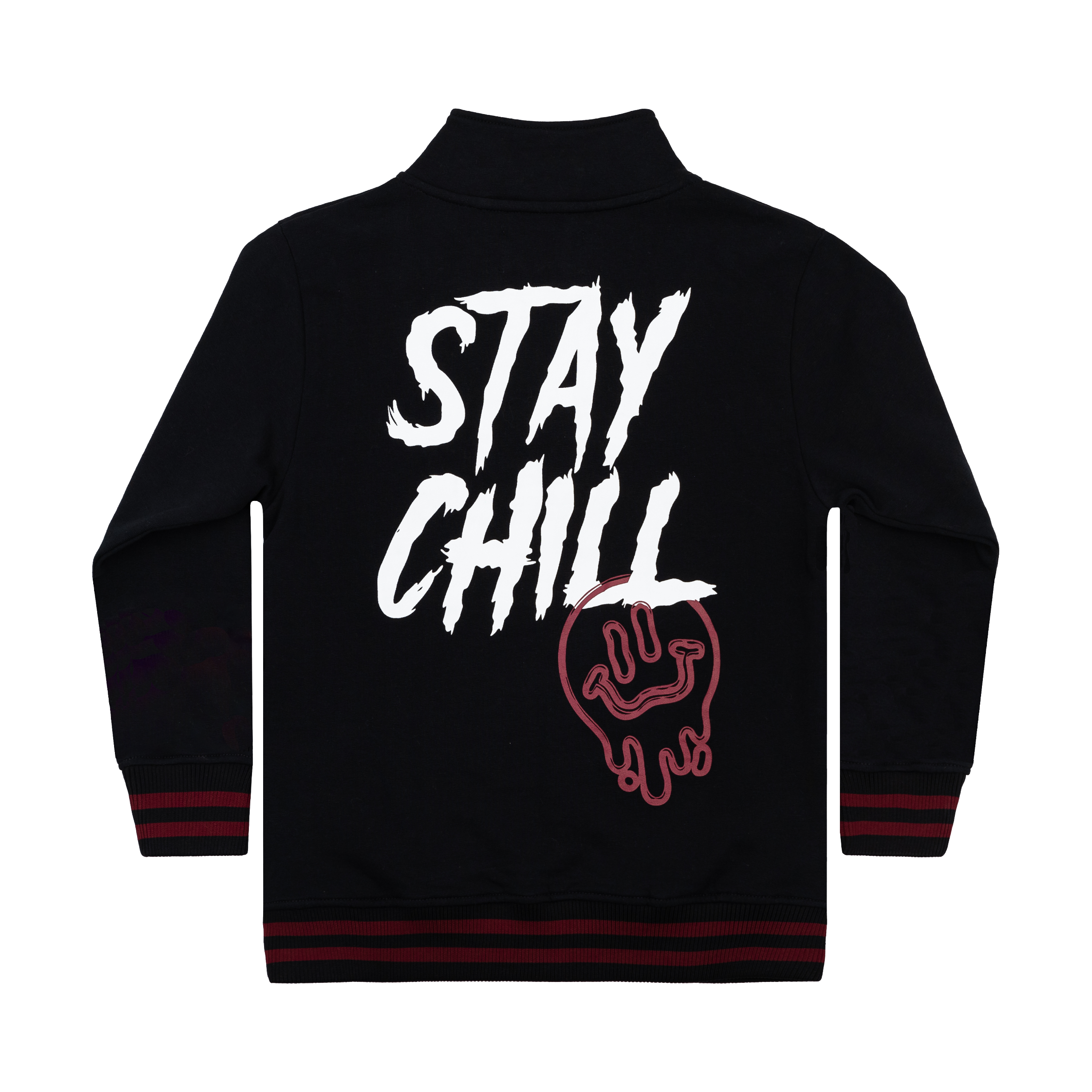 The Stay Chill Quarter-Zip Crew by Band of Boys is the perfect mix of simple and bold. Perfect for fun loving kids who like to make a subtle statement with their clothing. This fleece crew has a smiley face graphic on the front and a large ‘Stay Chill’ graphic reaching wide across the back. It has a high crew neck with top quality YKK zip, striped flat knit ribbing around the cuffs and hem, and a front kangaroo pocket.