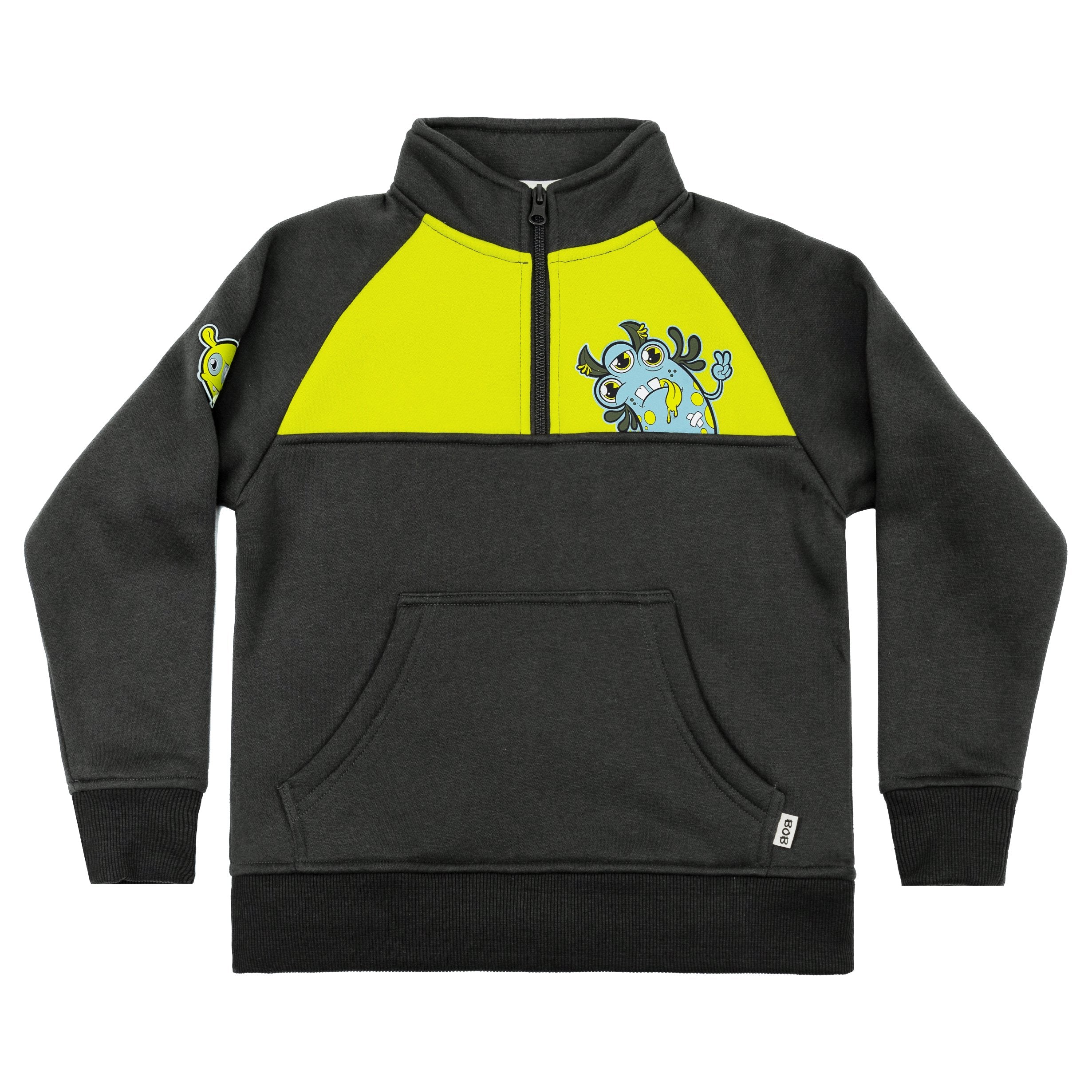 The Charcoal Monster Quarter-Zip Crew by Band of Boys ticks all the boxes this season. This fleece crew has a screenprint graphic on the front and back, and a fun rubber patch on the arm. It has a high crew neck with top quality YKK zip and a front kangaroo pocket for storing treasures and keeping hands warm on cooler days.
