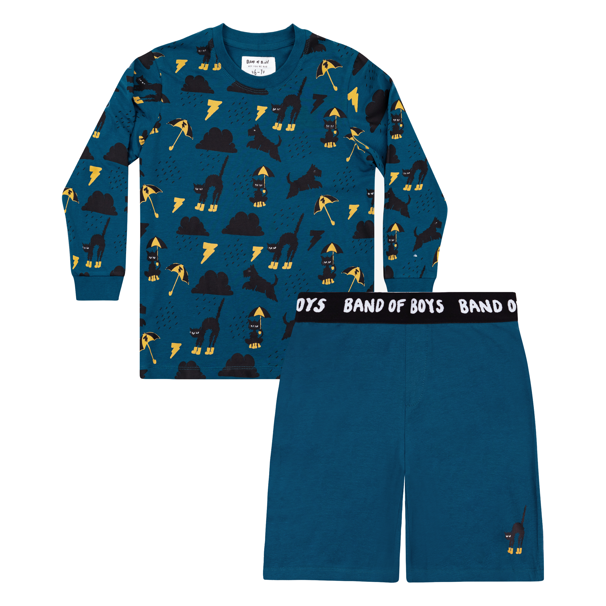 The Band of Boys Raining Cats + Dogs Pyjamas are perfect for kids who love to move, even in their sleep! The comfy shorts let their legs run free, making bedtime extra fun. Made from soft cotton jersey, these PJs feel great to wear. The comfy waistband has cool branding, and the slim-fit design helps keep your little one safe. They come in a handy drawstring bag—perfect for gifting!