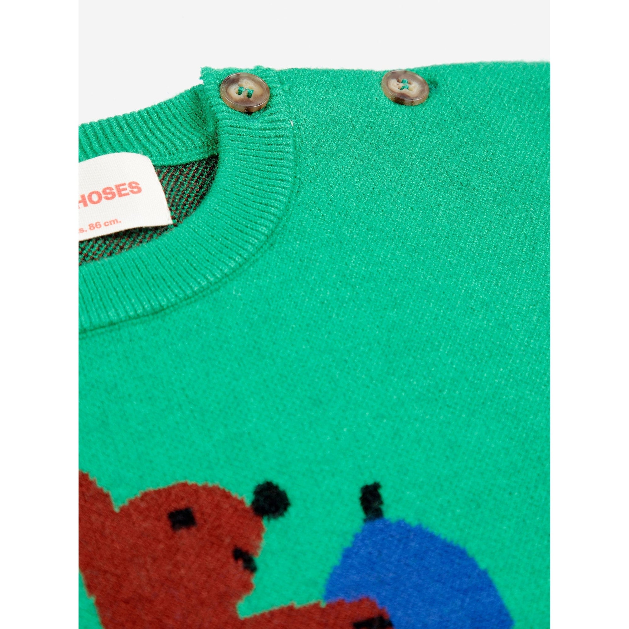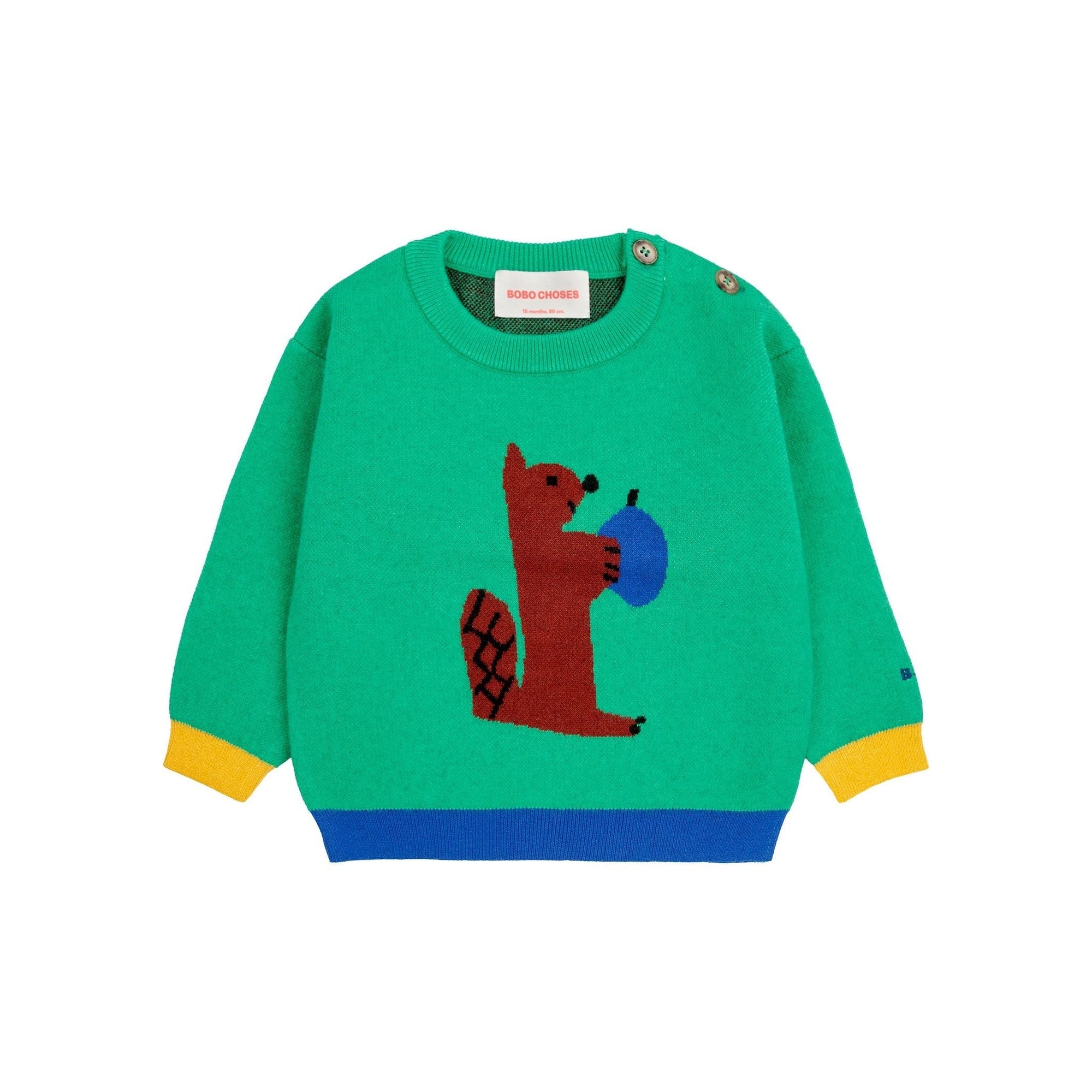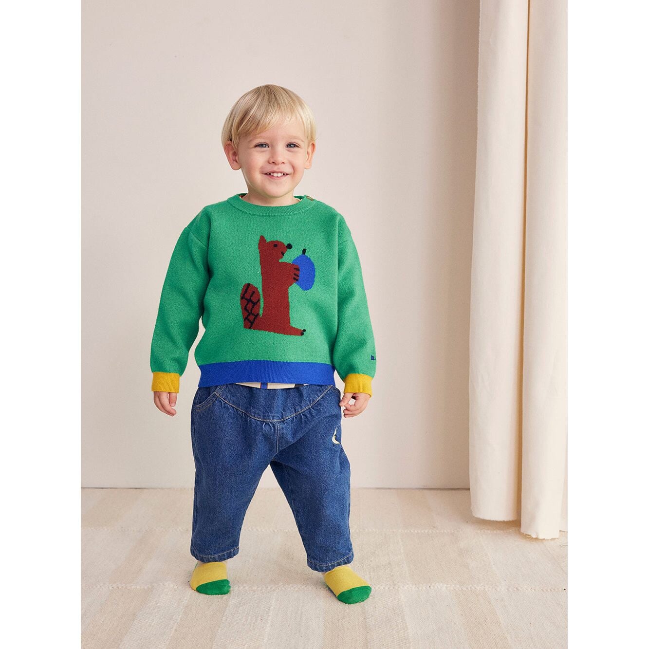 We want to fuel babies' creativity with playful garments like our green jumper 'Hungry Squirrel'. This piece features a fun design of the animal holding a large blueberry. Able to withstand the pace of the most intrepid explorers, boys and girls will feel comfortable at all times while living their own adventures.