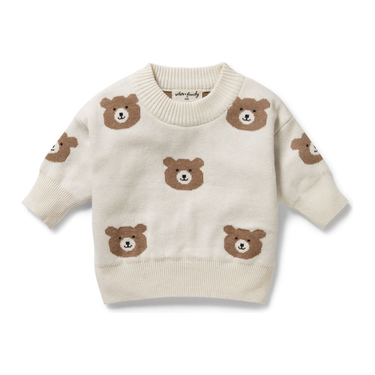 Get ready to cuddle up in style with our organic cotton, wool, and bamboo jacquard knit jumper. The roomy fit and ribbed cuffs and neckline provide comfort, while the cute bear face design adds some playful charm. Stay warm and trendy, baby and kid approved. Key Features: relaxed fit, long sleeved, all over jacquard design, packaged in a bio-degradable bag.