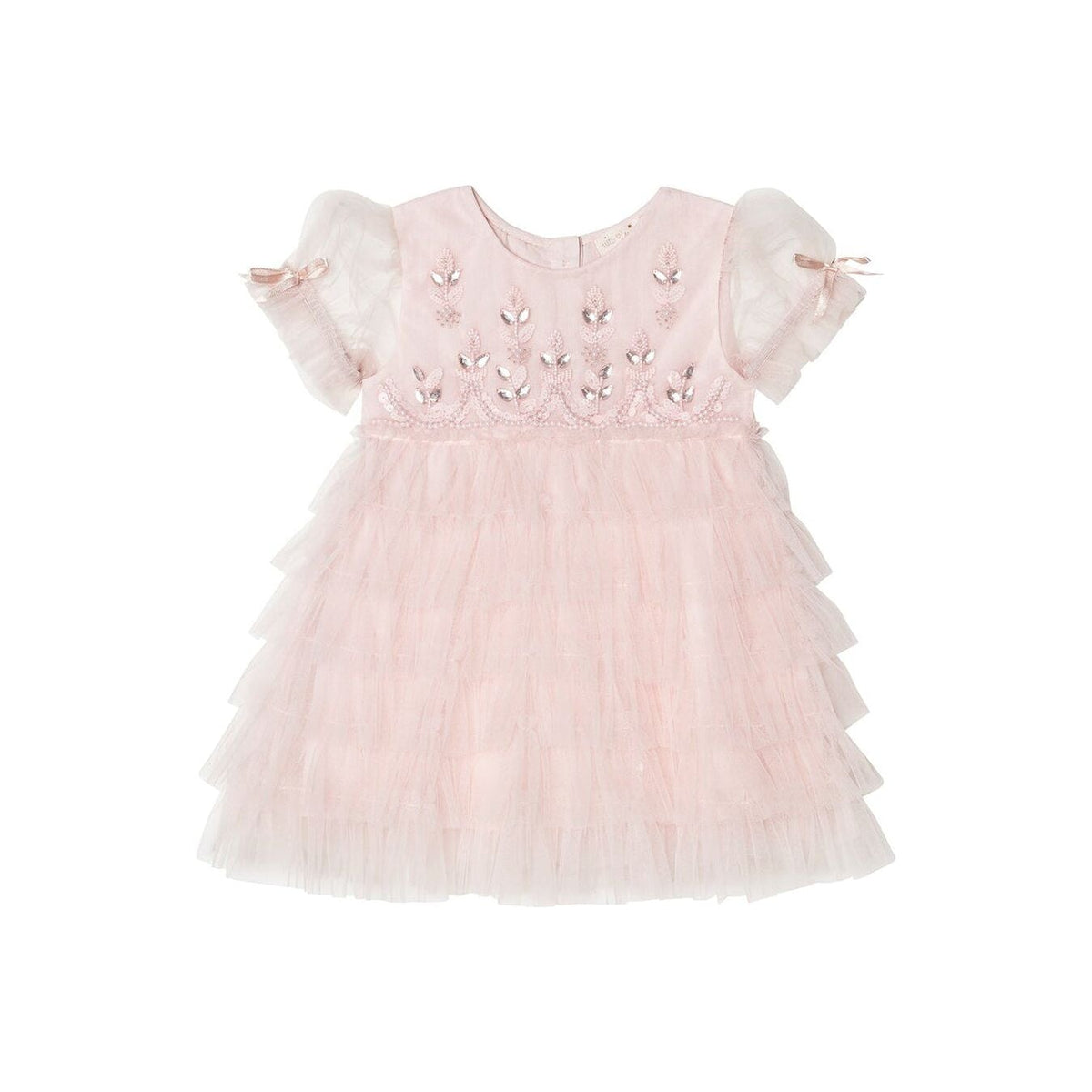 Introducing the Bébé Field of Dreams Tulle Dress in Pink Cloud! This enchanting dress features a round neckline, tulle puff sleeves complete with a satin bow and delicate hand embellisment on the bodice. With a tiered ruffled tulle skirt and a high waist, it exudes charm and grace. Perfect for special occasions, let your little one blossom in this exquisite ensemble.