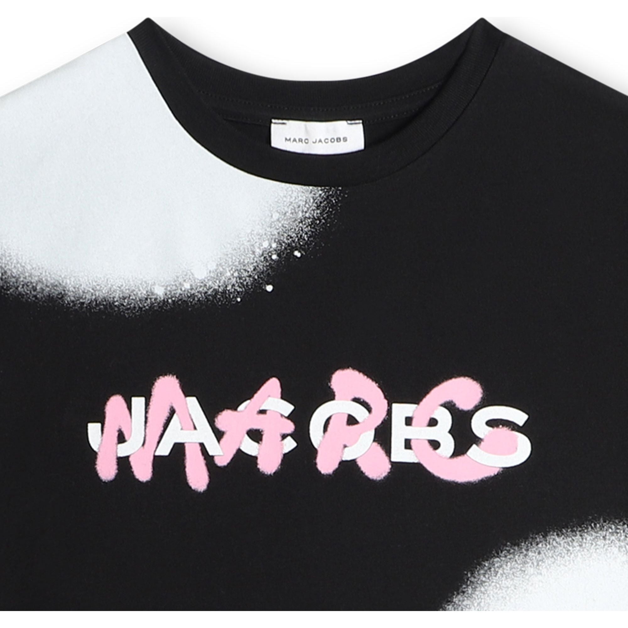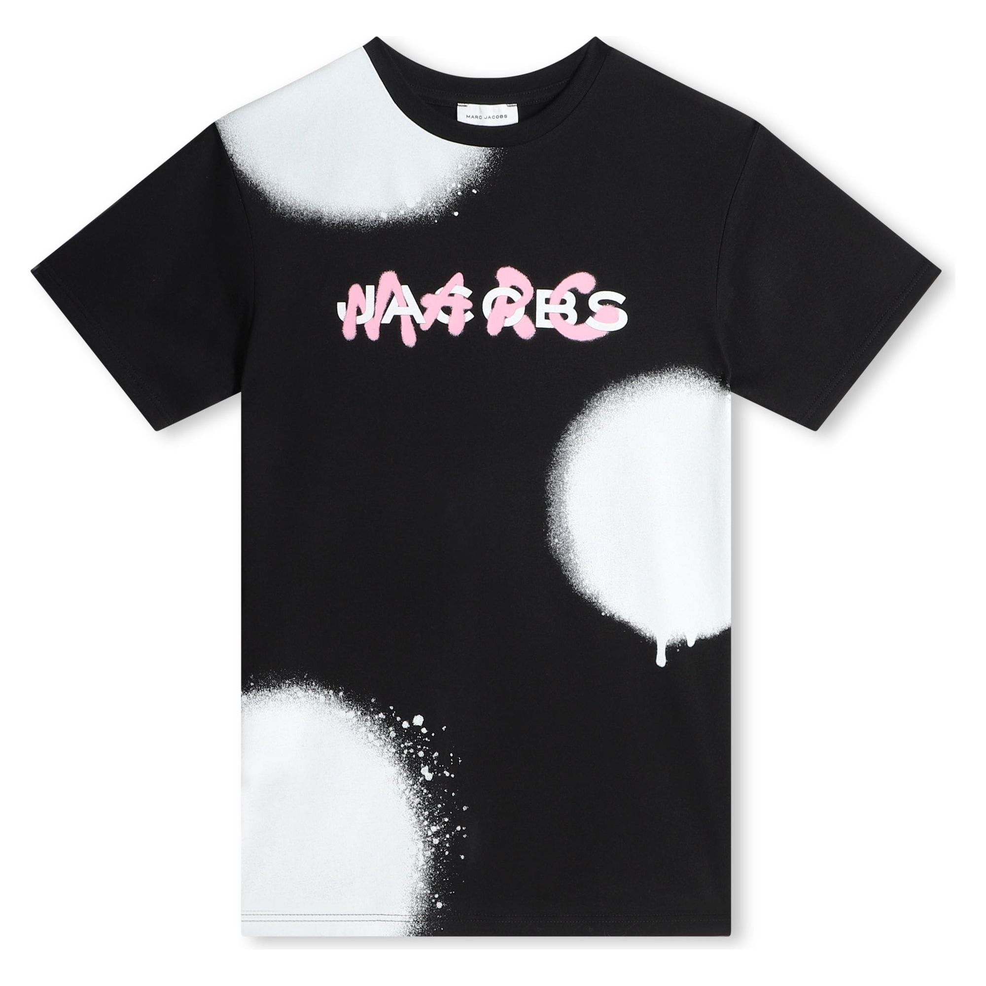 Pretty black and white logo dress for girls by luxury designer MARC JACOBS. Made from soft cotton jersey, it features the brands logo in white and pink on the front and oversized white dots spray painted print.