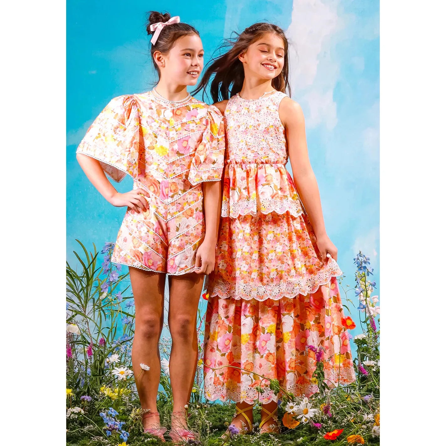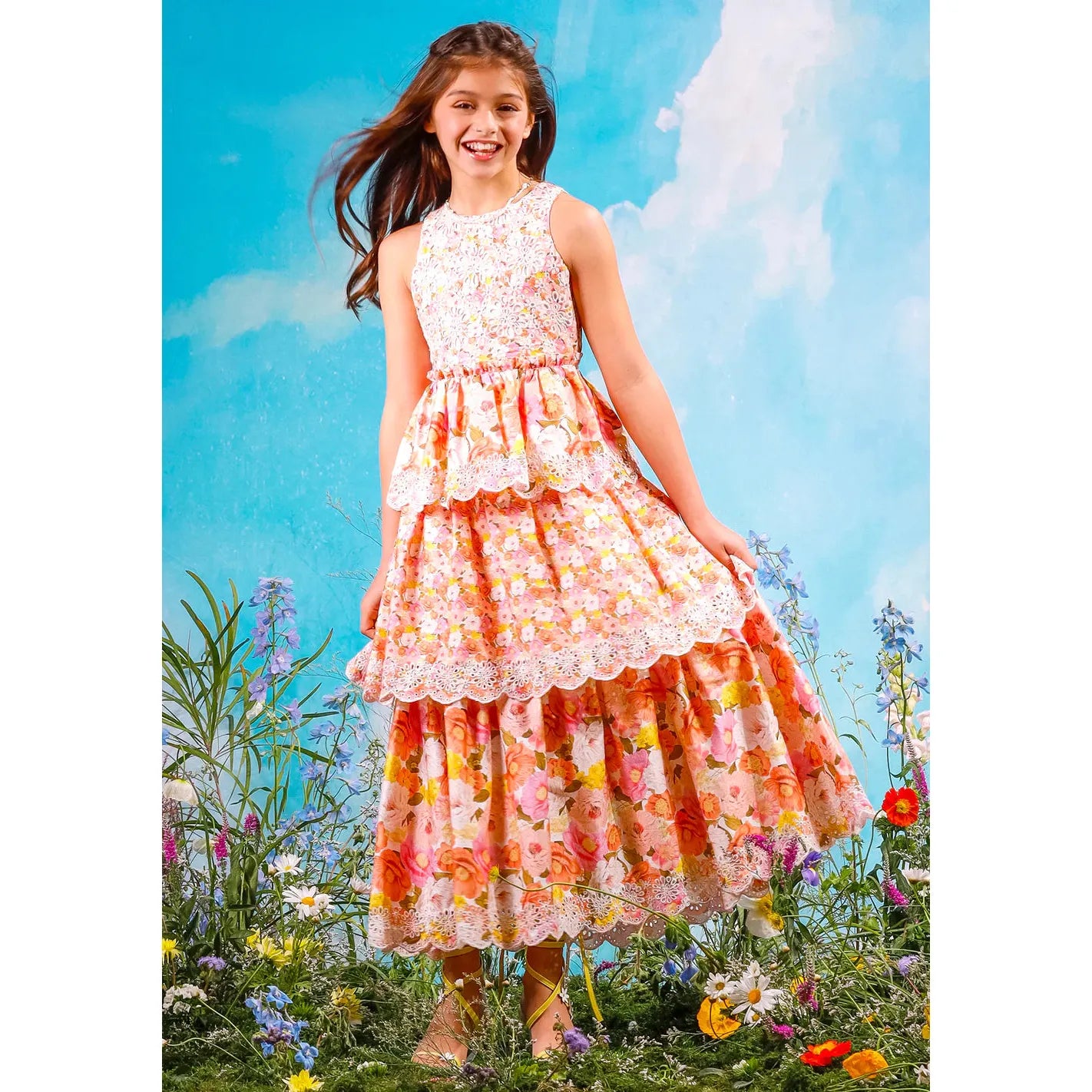 Step into a world of blossoms with our Blossom Embroidered Maxi Dress. This floral masterpiece features an exquisite embroidered floral fabrication that blooms with elegance. With its open back detailing and maxi length, your little one will shine at every occasion.