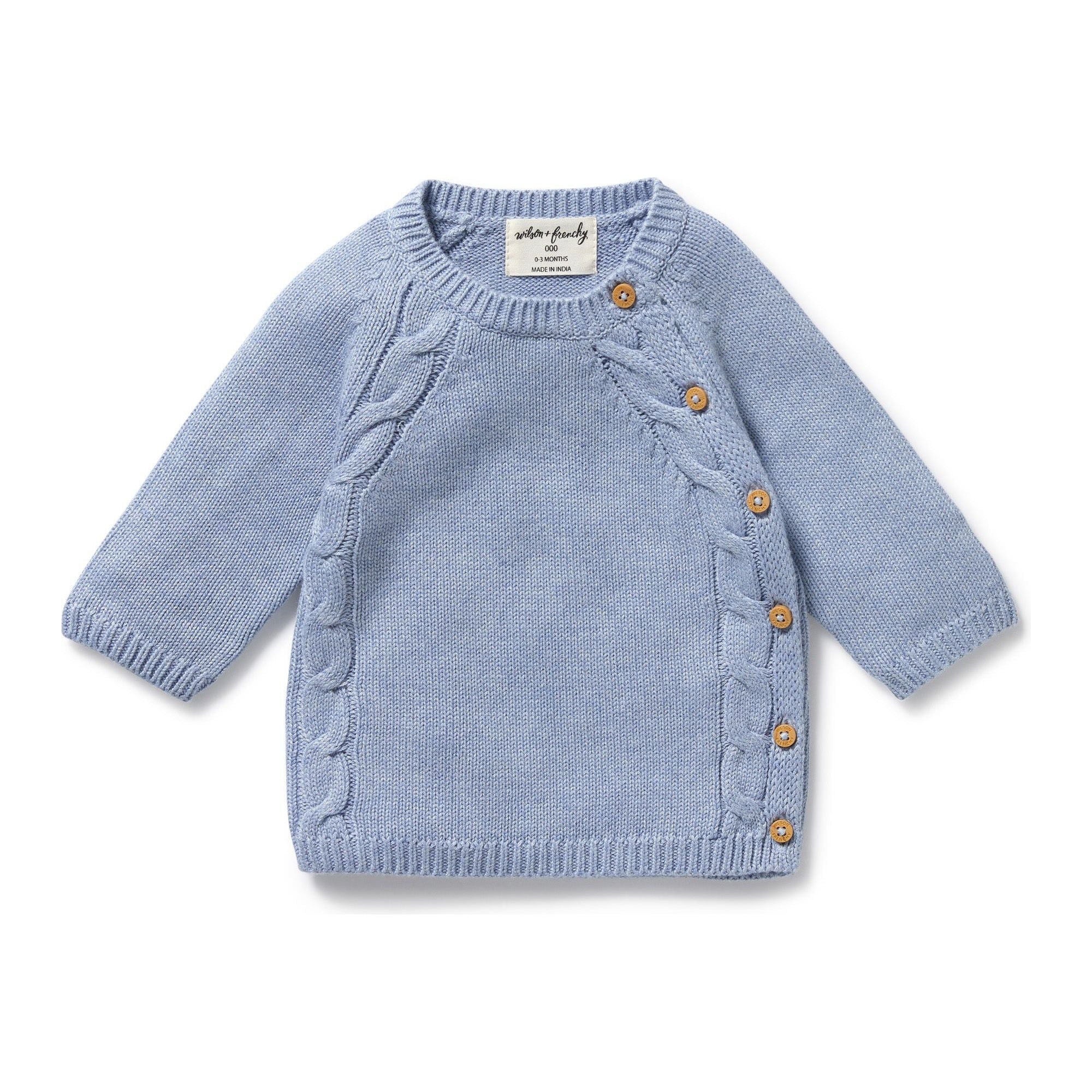 Introducing our knitted kimono cardigan for babies. With a cosy cross over design, long sleeves, and mock wood buttons, this cardigan is both stylish and functional. Made from a blend of organic cotton, bamboo, and wool, it's easy to put on and take off, providing extra warmth for your little one. Comfort and cuteness combined. Key Features: Rounded neckline with side front button opening, mock wood buttons, double layer front, organic cotton, bamboo, wool blend, packaged in a bio-degradable bag.