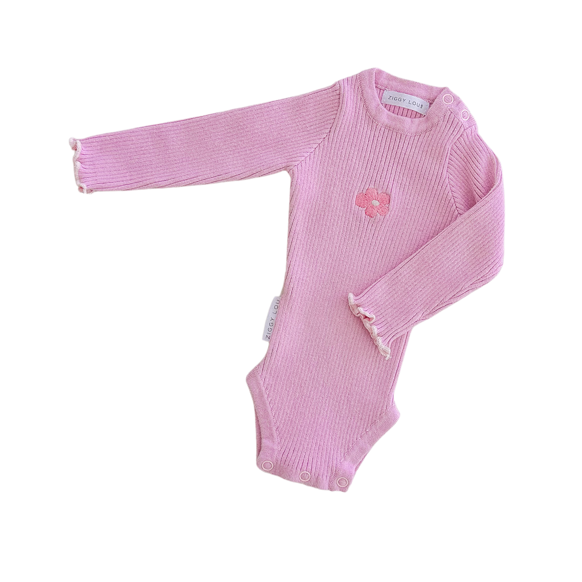 Ribbed, long sleeve bodysuit featuring embroidered Cora flower on the front. Functional press snaps at crotch for easy nappy changes and press snaps on shoulder for easy on/off. Match with our Dahlia + Bamby Easter Collection.