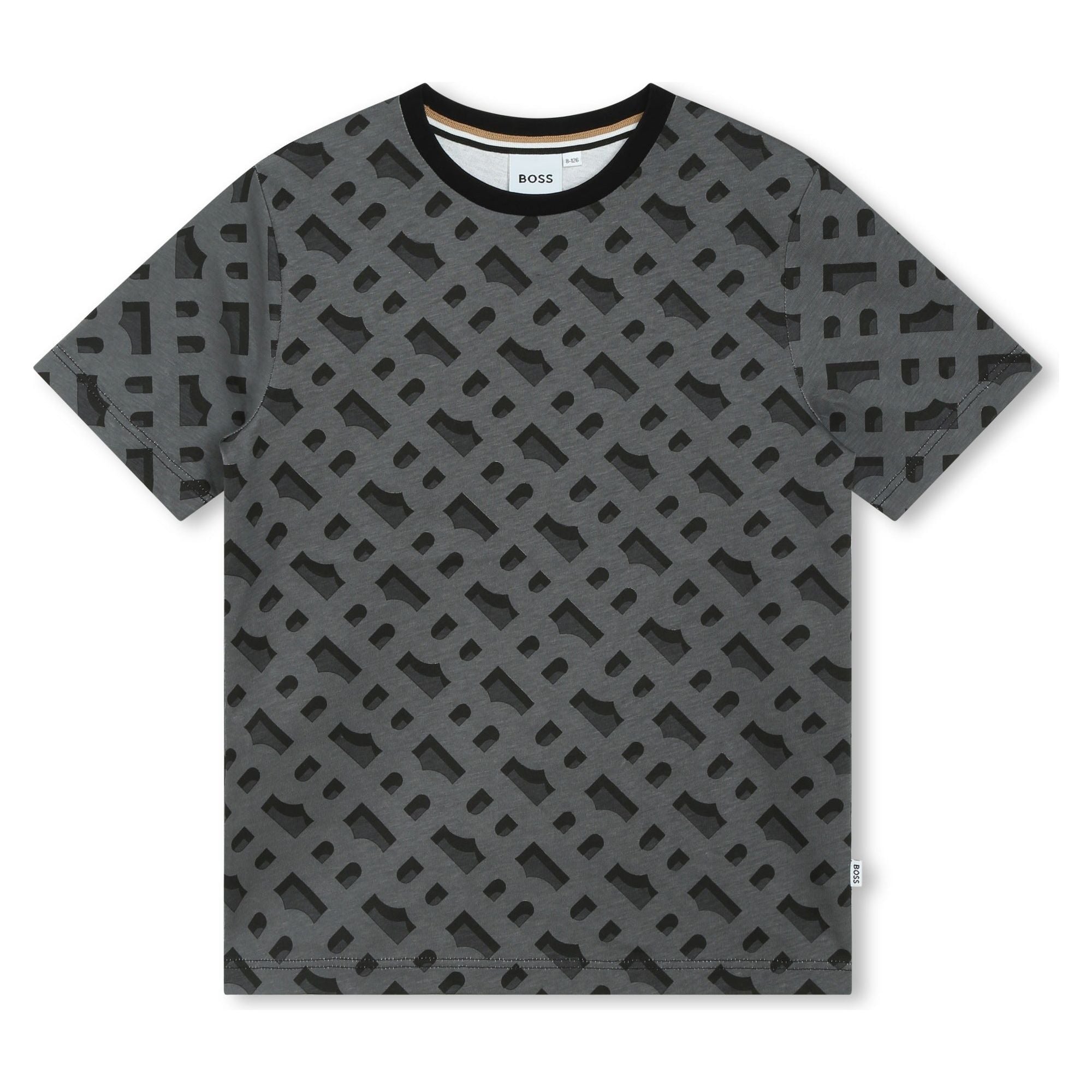 This BOSS short-sleeved T-shirt effortlessly combines elegance with everyday comfort. It is made of 100% cotton and elastane with a fitted cut. It features an all-over print and a BOSS label on the side.