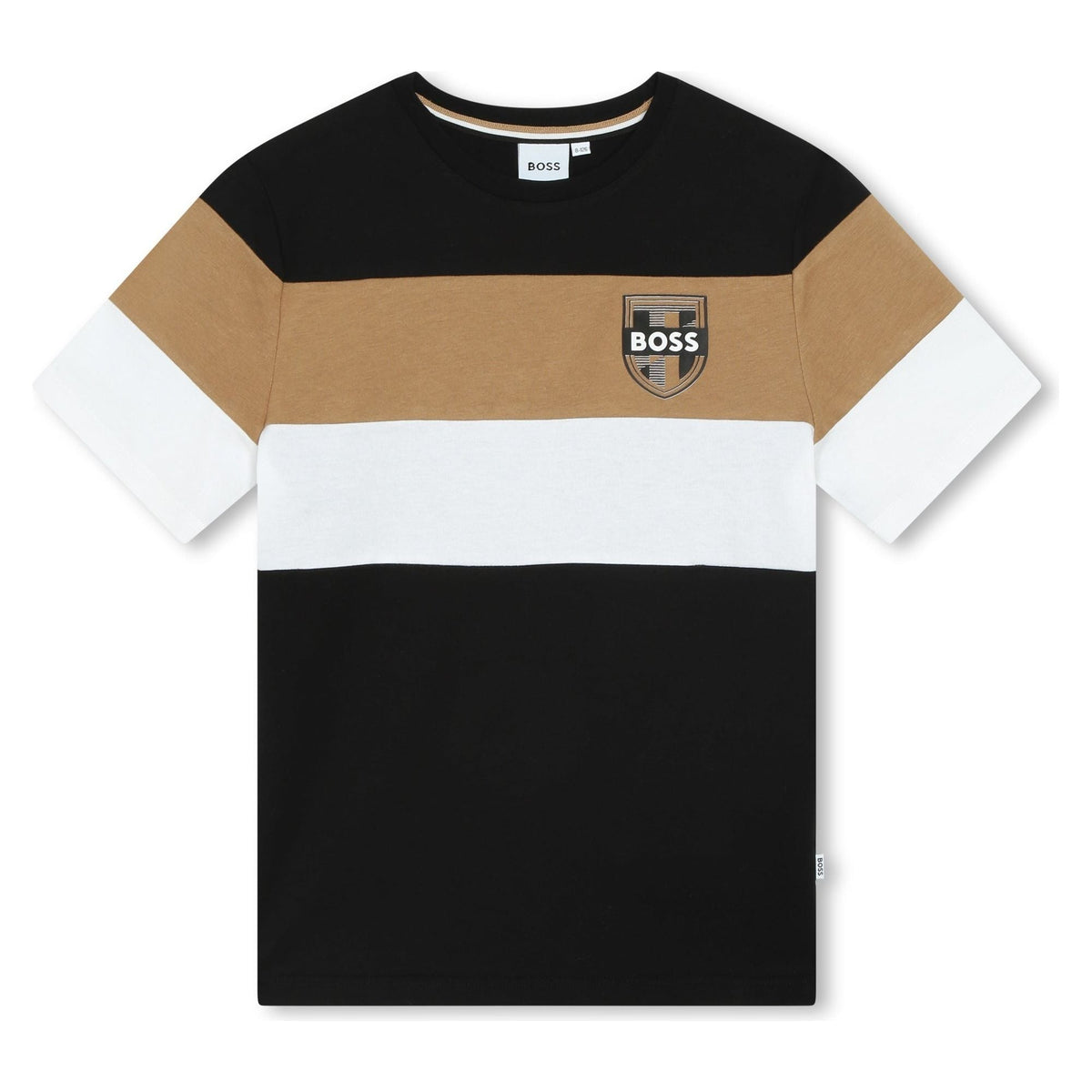 This BOSS short-sleeved T-shirt is an essential for your summer wardrobe. Made from 100% cotton, it features a straight cut, two stripes on the front and a printed BOSS badge on the chest.