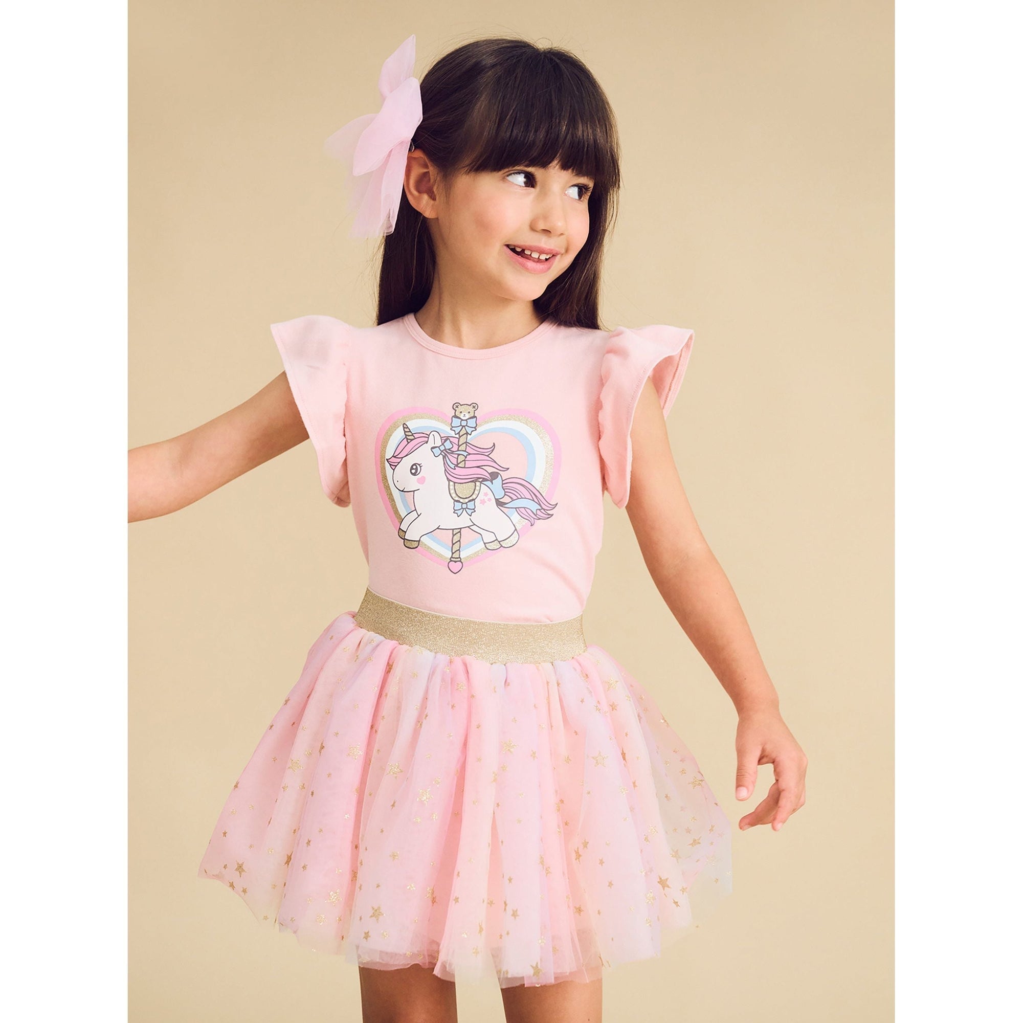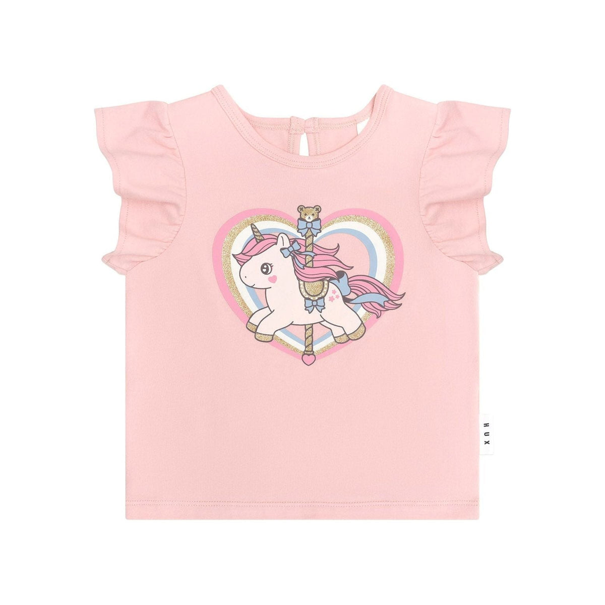 Super soft, premium organic cotton jersey frill sleeve t-shirt with carousel unicorn print