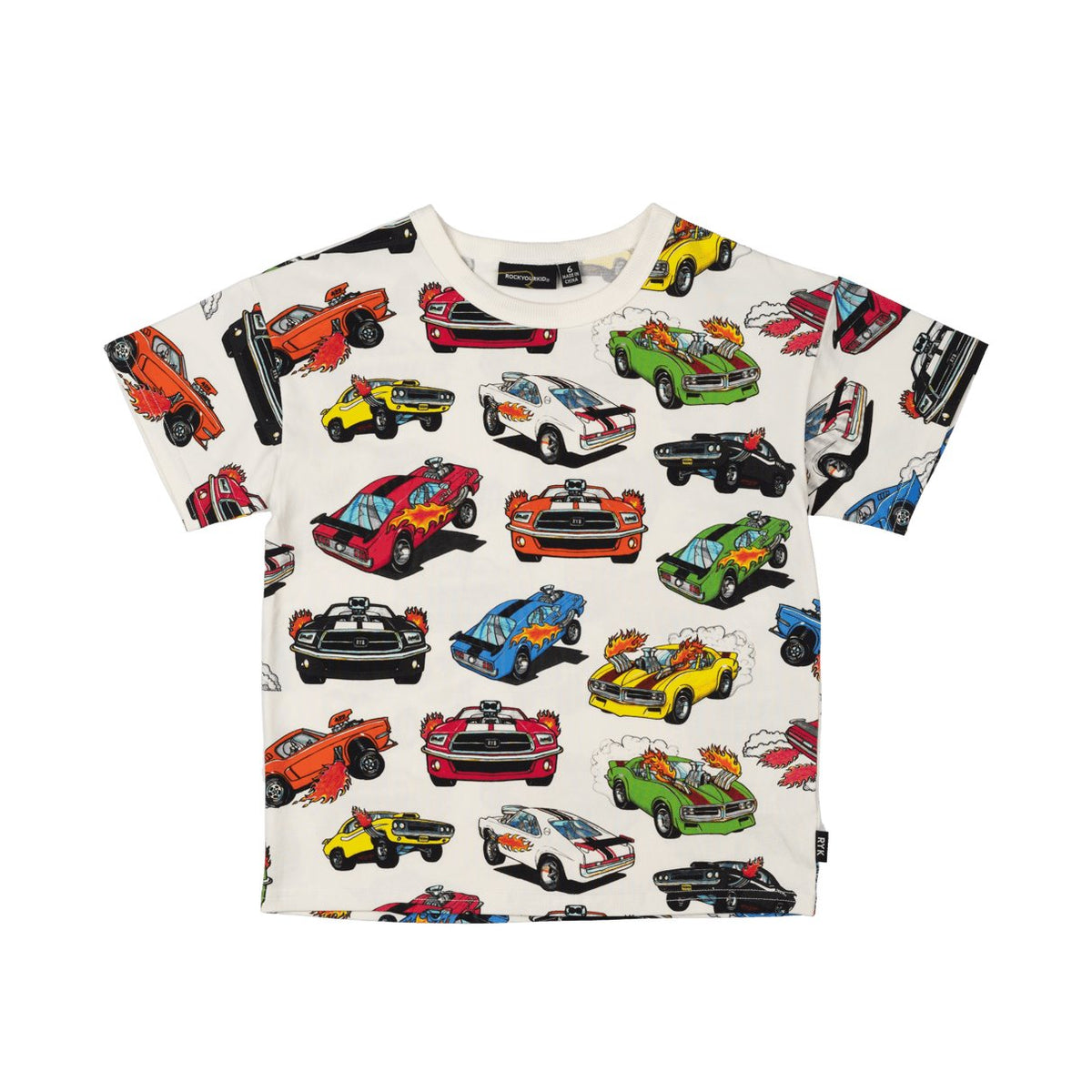Introducing our Cars T-Shirt! Made from 95% cotton and 5% elastane jersey, this boxy, looser fit t-shirt is fitted with drop shoulder Shortt sleeves and ribbing across the neck. The cream base feature a colourful car pattern throughout.