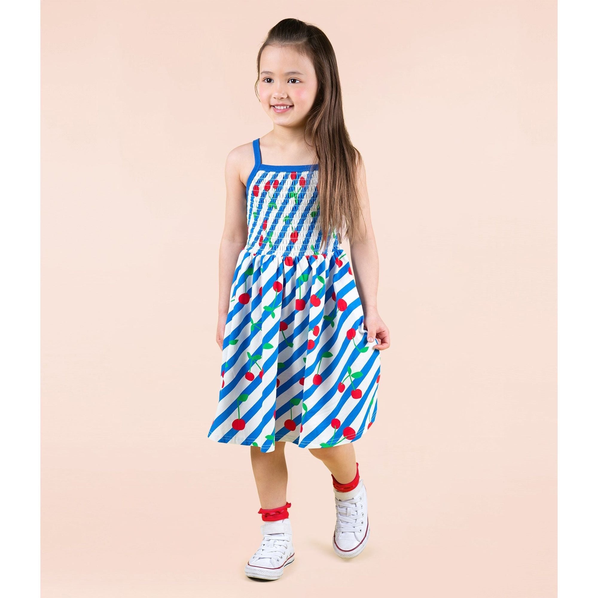 Introducing our Cherry Stripes Sun Dress! Made from 95% cotton and 5% elastane jersey, this dress features a shirred bodice, high waisted gathered skirt, blue ribbing across the neck and straps and a blue and white striped base with cherries.