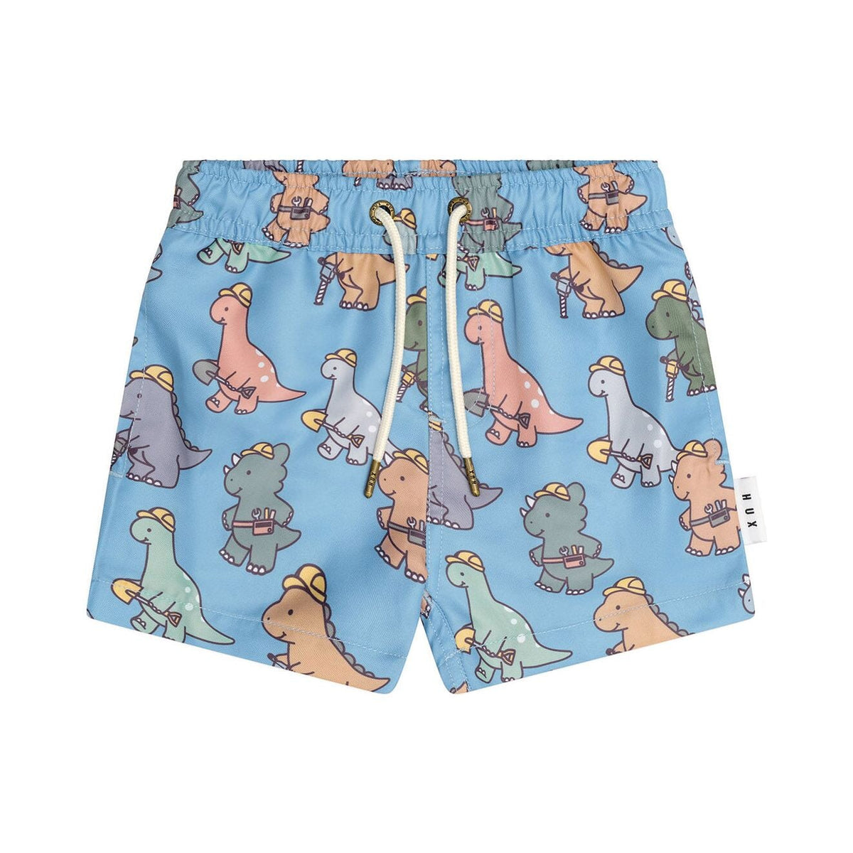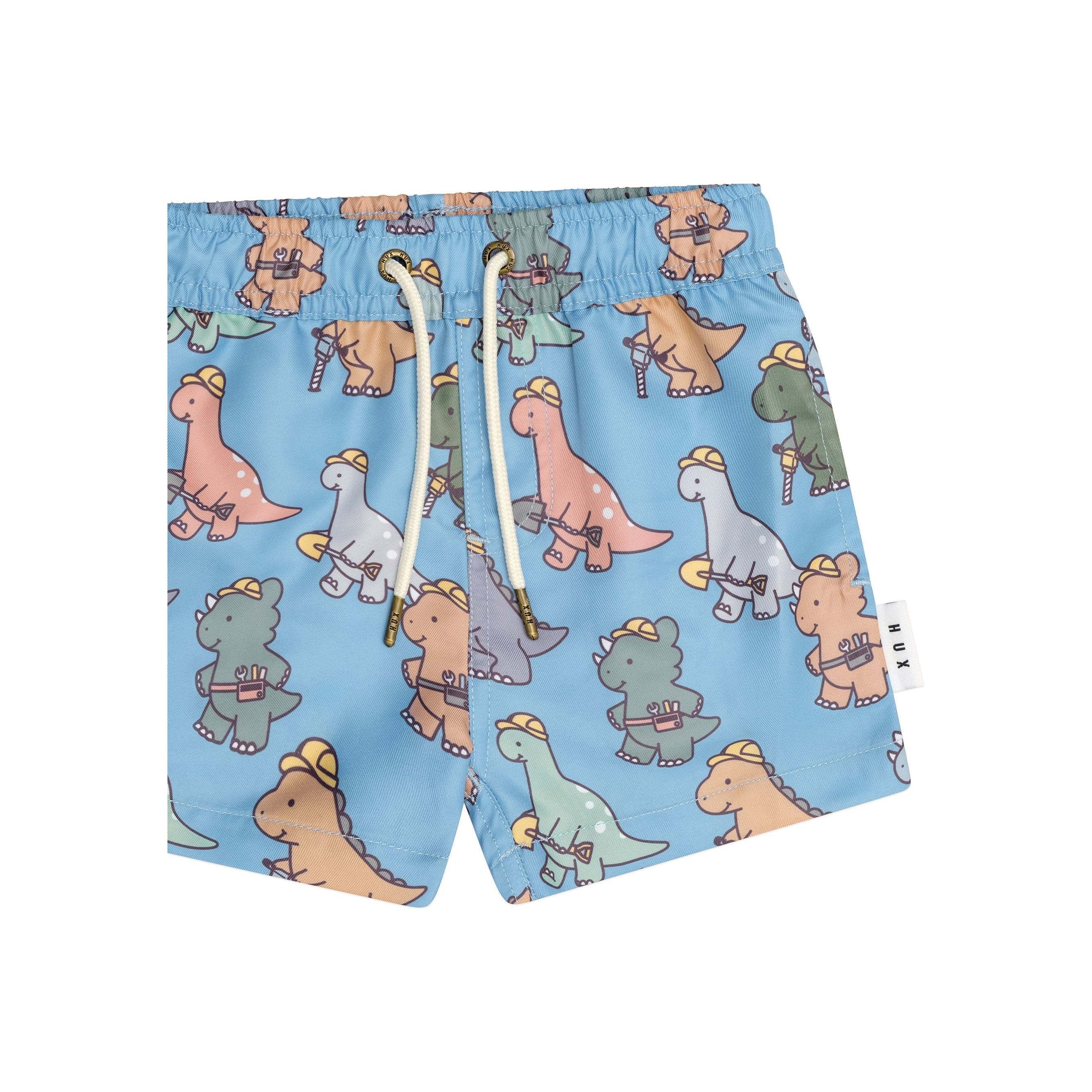 Swim shorts with all over construction dino print, side pockets and adjustable drawstring