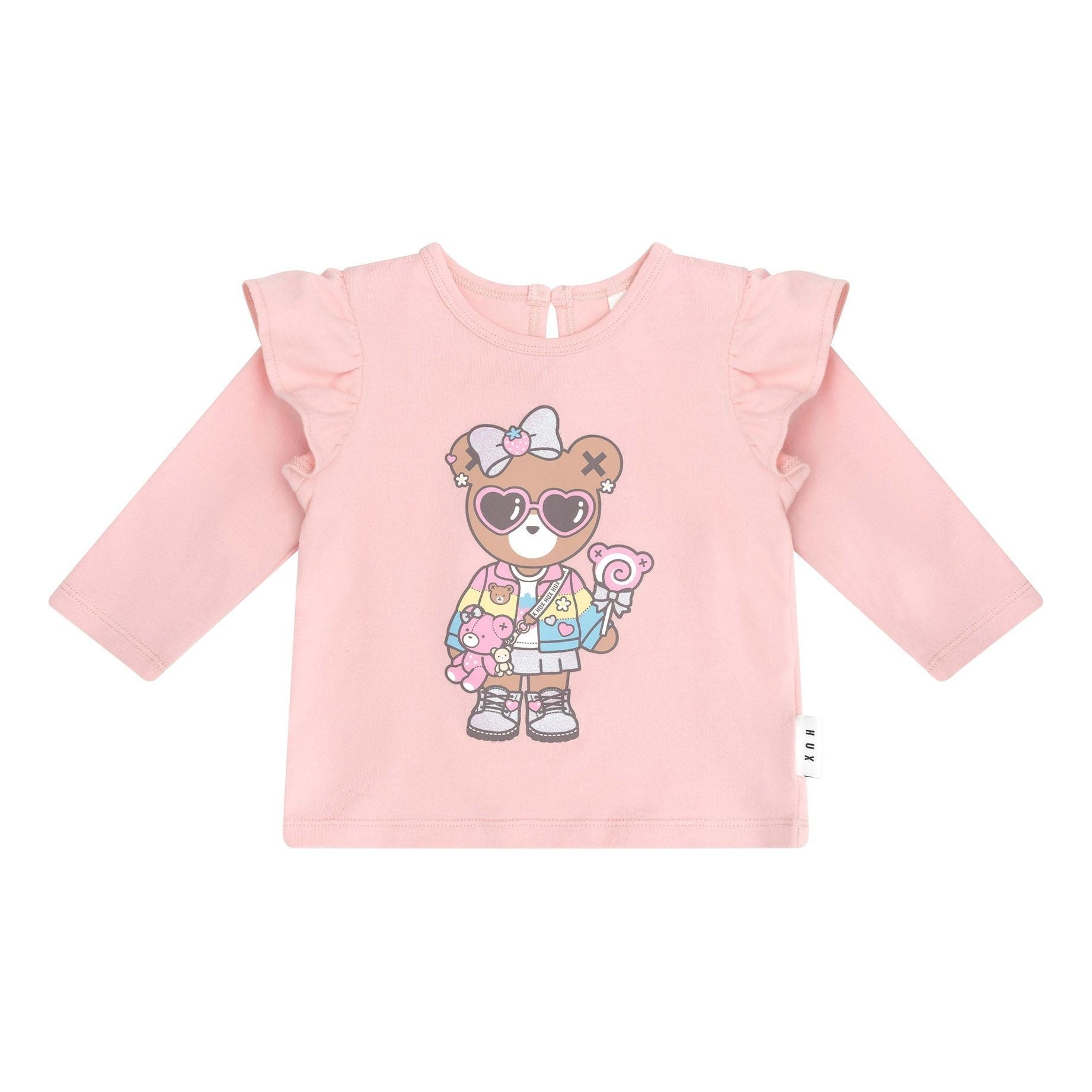 Super soft, premium organic cotton jersey long sleeve frill top with cool girl bear print