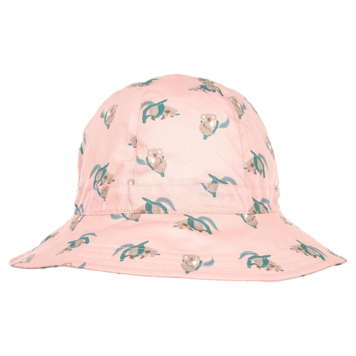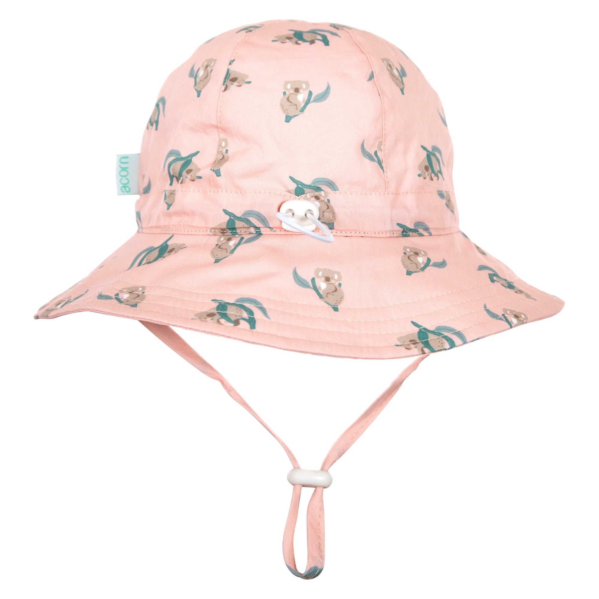 Wide brim sunhat with an adorable Koala print on a pink base design by Jacinta Weir from Two Little Ducklings. Elasticated toggle around the head for the perfect fit. Cord and toggle under the chin to keep the hat in place. Wide brim (Measures for each size S: 6cm, M: 6.5cm, L: 7cm, XL: 7.5cm). Material: 100% Cotton including lining. Tested and certified as providing UPF50+ sun protection.