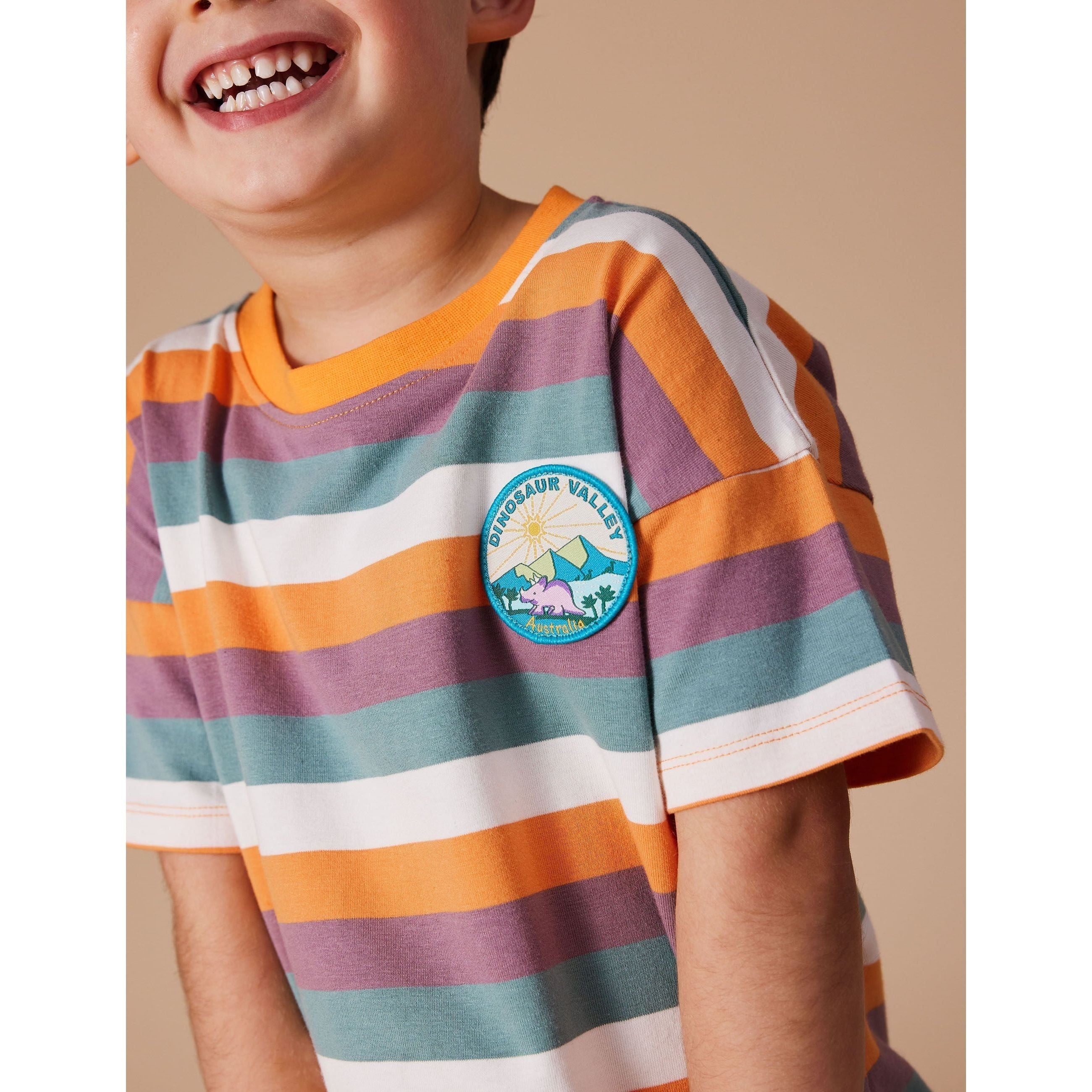 Hand drawn badge. Snap buttons along the neck up to size 2Y for easy dressing