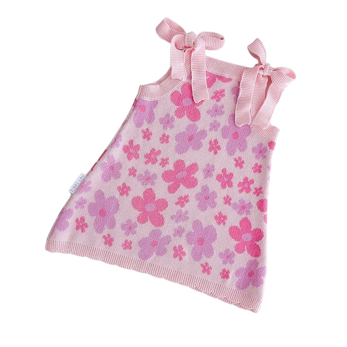 Knitted jacquard dress featuring our Cora floral design. Adjustable ties at shoulder for the perfect fit and scalloped hem detail. Mix and match with items from our Cora Collection