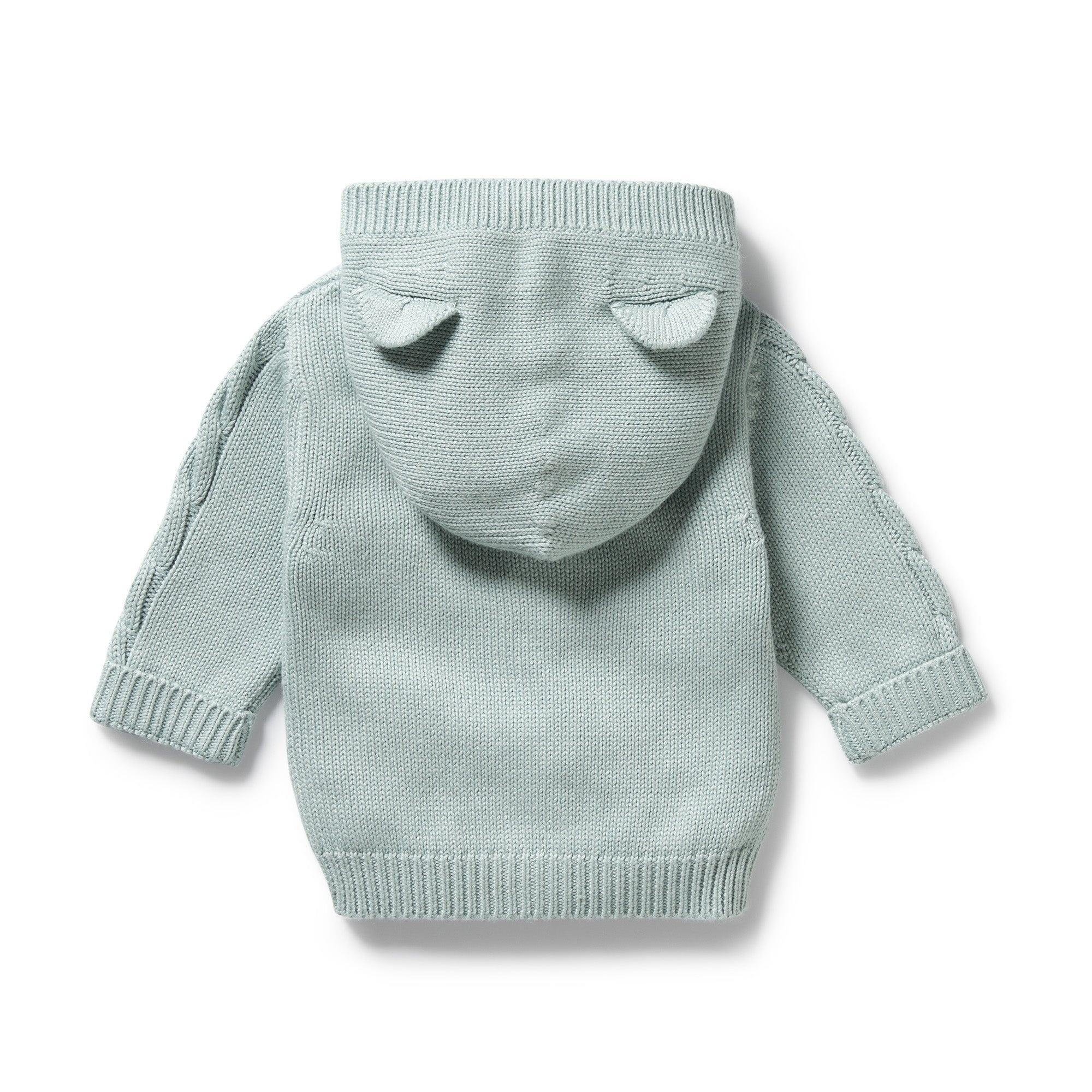 Introducing our cosy knitted jacket with a hood and adorable bear ears. Made of a luxurious blend of organic cotton, bamboo, and wool, this jacket features a button front opening and a cable design on the front. Stay warm this winter with our baby-friendly design. Key Features: Bear ears detail, front button opening, mock wood buttons, cotton, bamboo, wool blend, packaged in a bio-degradable bag. Details: 50% organic cotton, 43% bamboo, 7% wool. Gentle machine wash. Made in India.