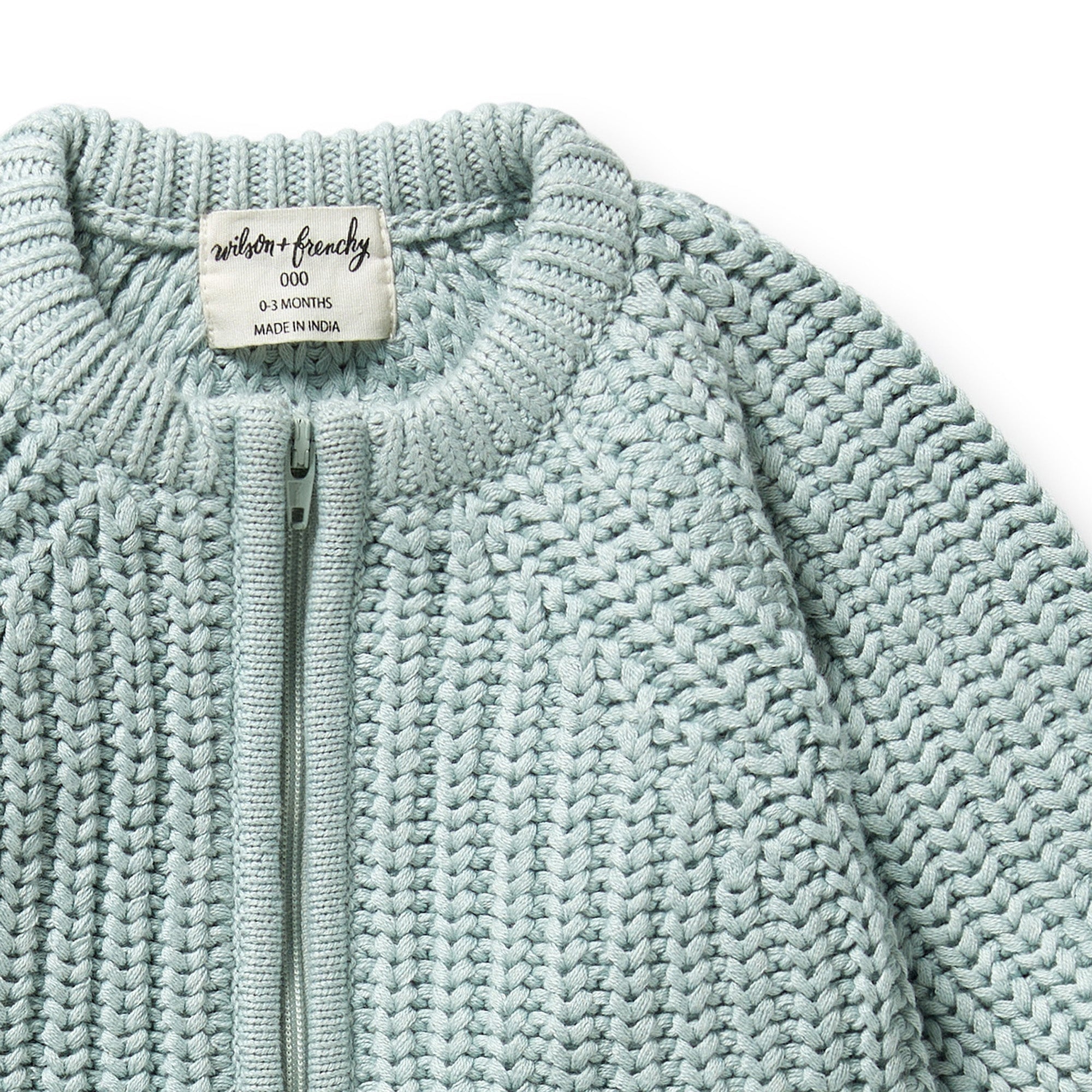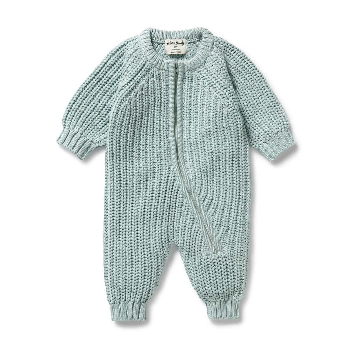 Made from a beautiful blend of organic cotton, bamboo and wool, this luxurious long sleeve knit growsuit features a chunky rib design and zip through opening for quick and easy nappy changes. Perfect for play dates and outdoor adventures, pair it with a knitted hat or blanket for a gorgeous baby shower gift every parent will love. Key Features: Round neckline with front zipper opening, long sleeved, full length. Packaged in a bio-degradable bag. Details: 50% organic cotton, 43% bamboo, 7% wool. Gentle machine wash. Made in India.