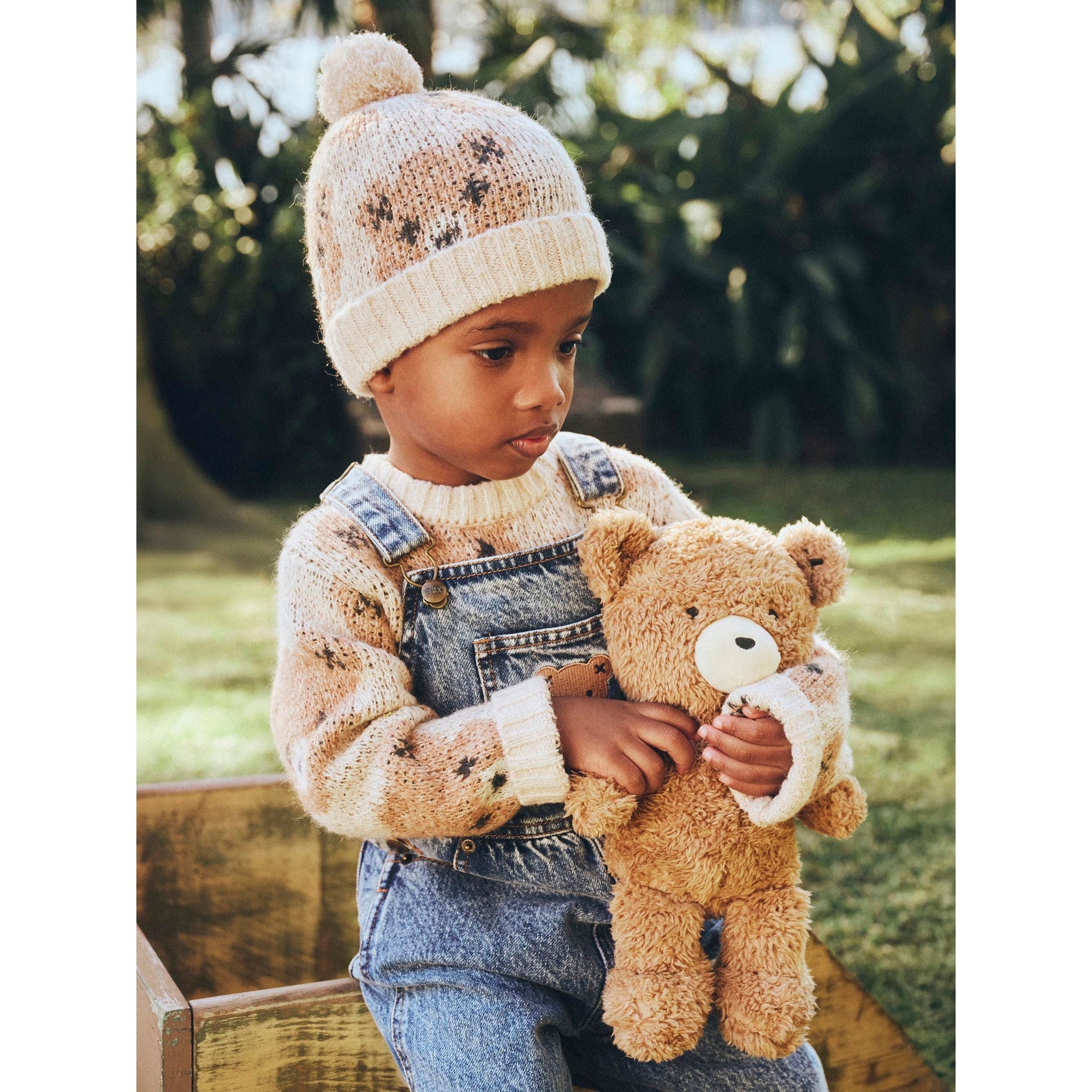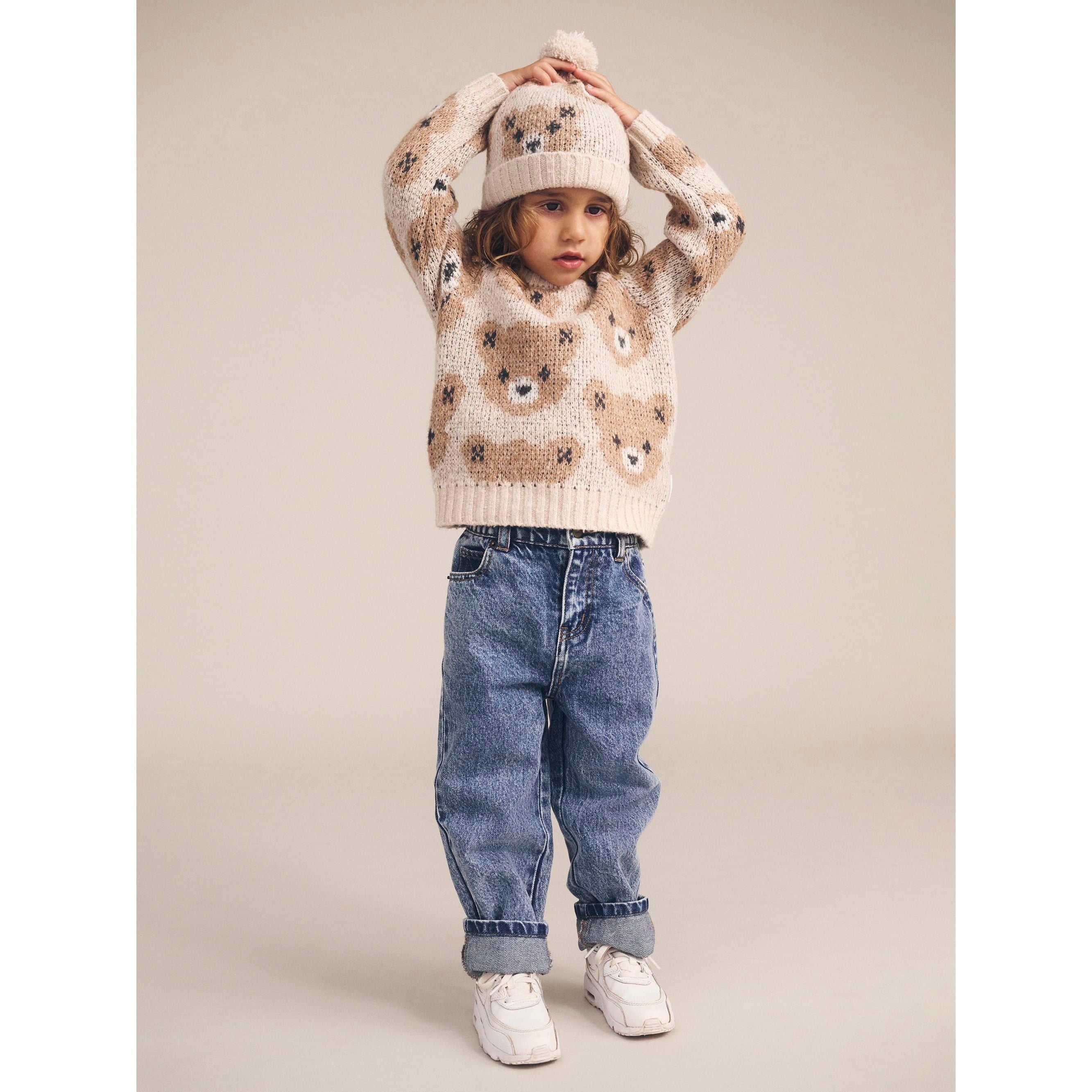 If Huxbear could hug, it would feel like wearing this beige sweater. This luxuriously thick jacquard sponge knit jumper is the ultimate cosy layer. Warm enough to get you through the coldest months, it features an all over Huxbear pattern and shoulder buttons in baby sizes.