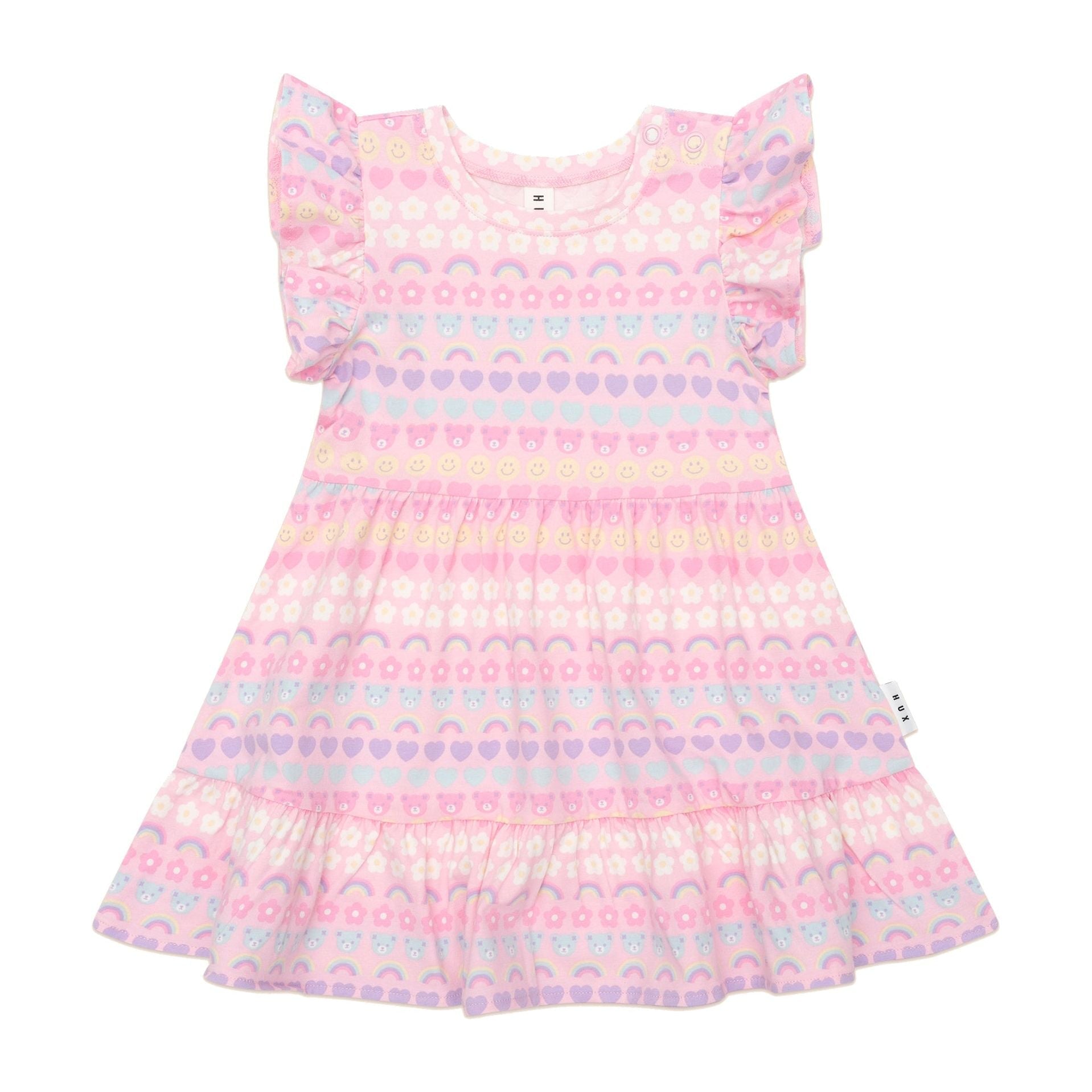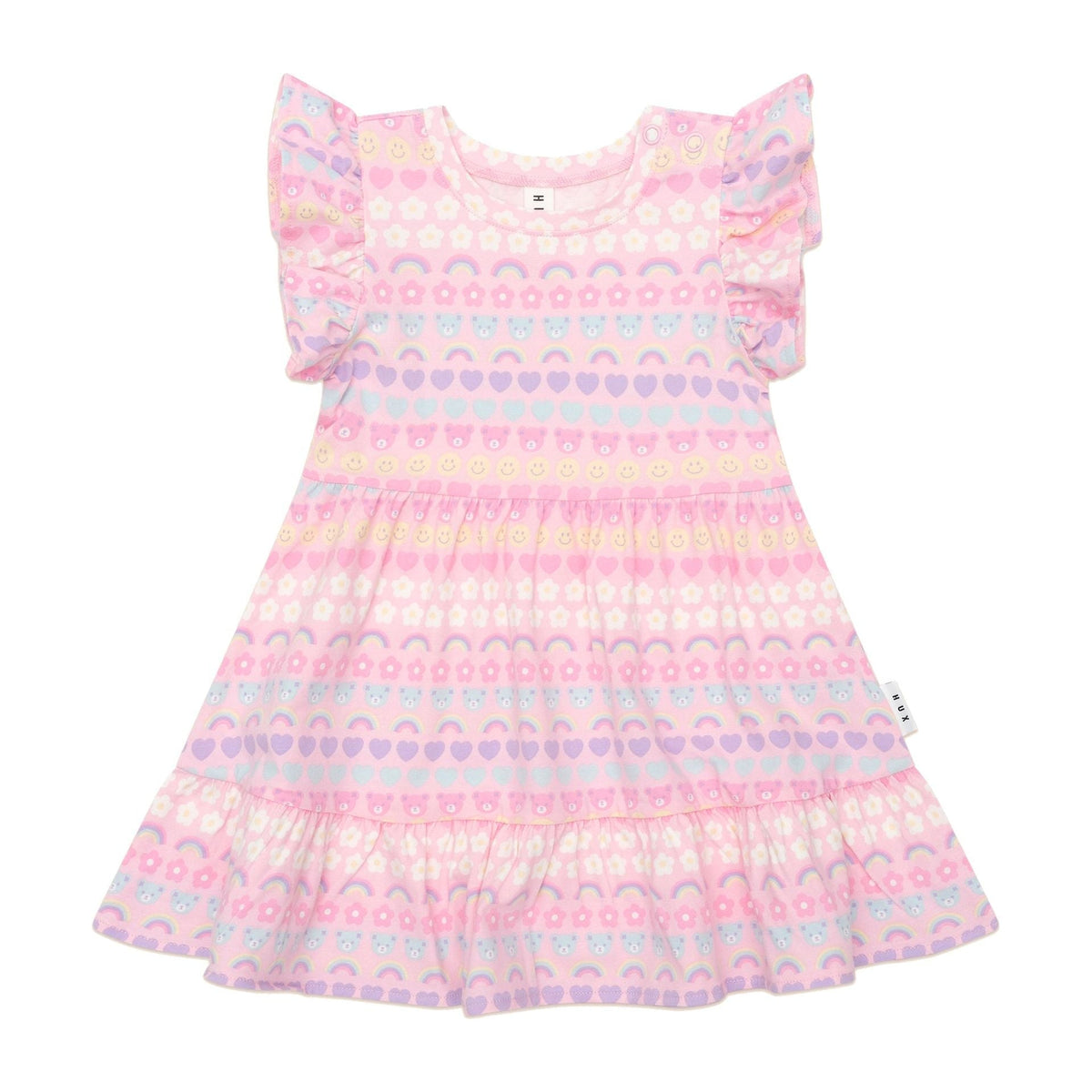The perfect everyday dress, upgraded. Made from soft organic cotton jersey, this pretty pink number features sweet shoulder frills, a playful emoji print in shades of pink and a tiered skirt for comfy wear. Baby sizes include stainless steel shoulder snaps for easy dressing. Play the day away.