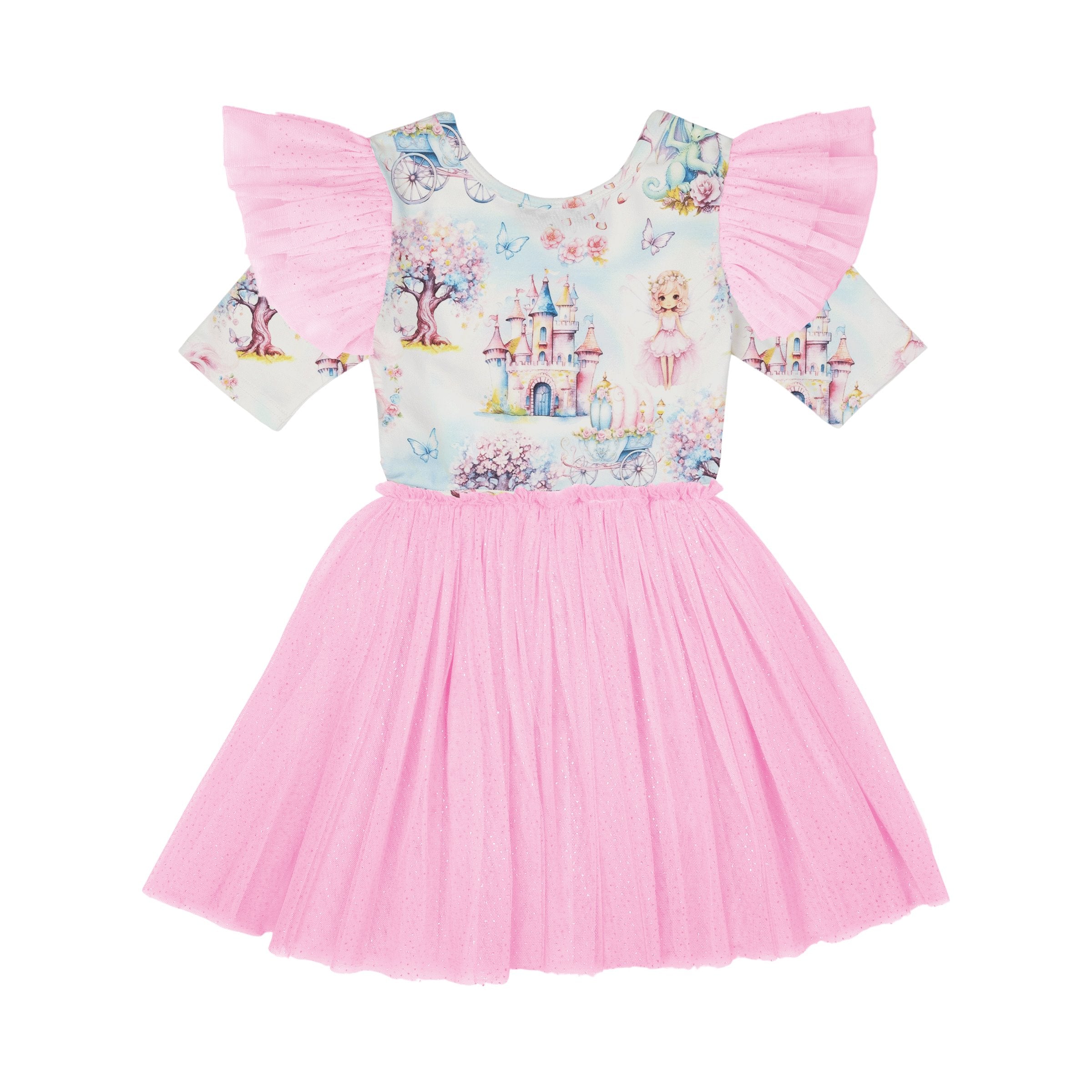 Introducing our Fairy Land Circus Dress! Made from 95% cotton and 5% elastane jersey, the bodice features short sleeves with pink glitter tulle shoulder ruffles and a fairy-inspired print. The skirting features layers of pink glitter 100% polyester tulle.