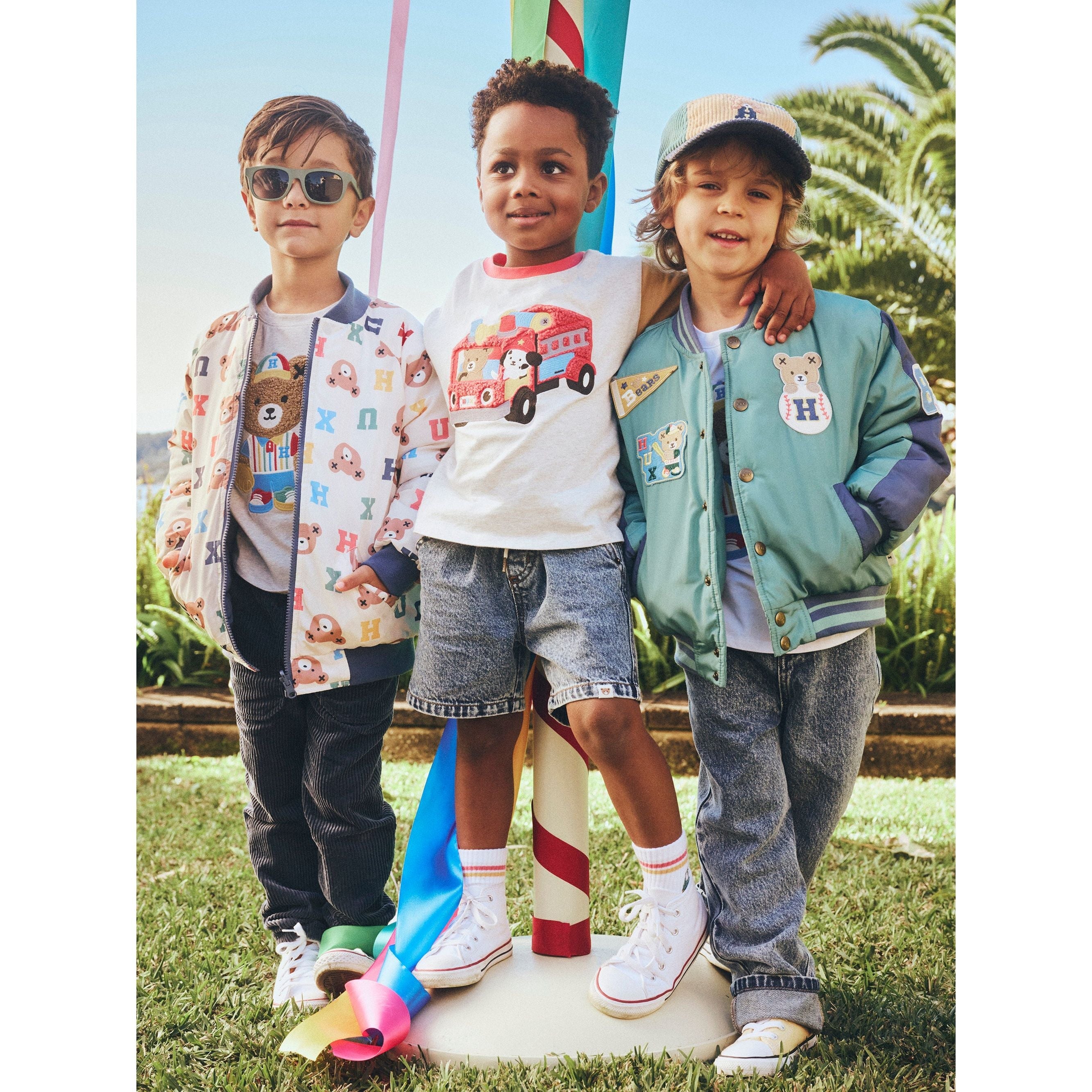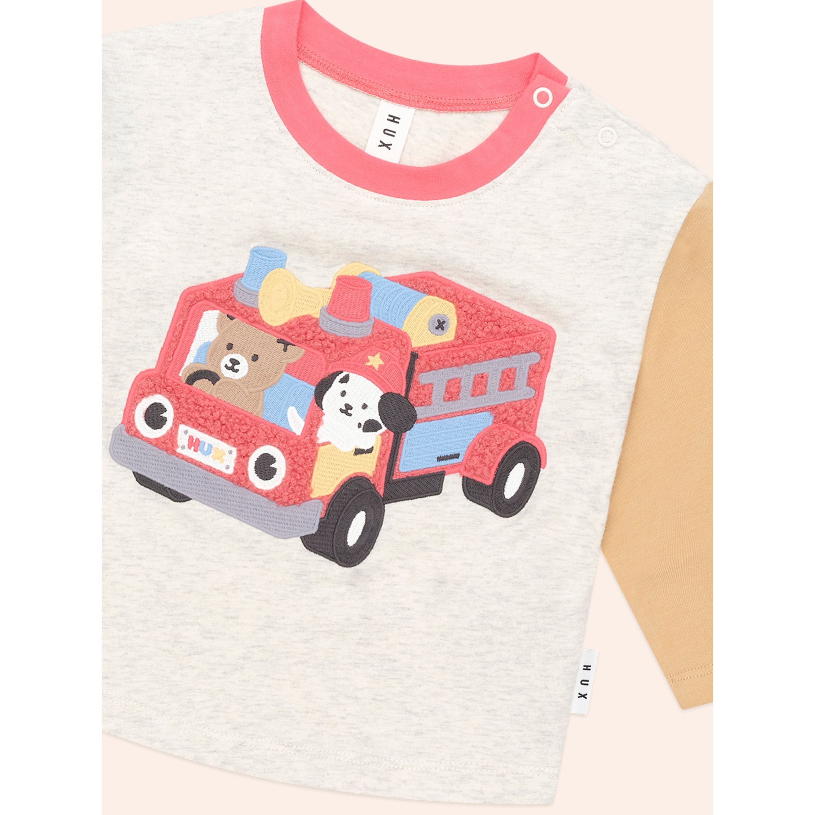 A long-sleeved round neck top in off white marle and block colours. Made from cloud-like organic cotton, it features a tummy-sized fire truck embroidery in the softest furry fabric. Bound to become their new everyday favourite, baby sizes include stainless steel shoulder snaps for even easier dressing.