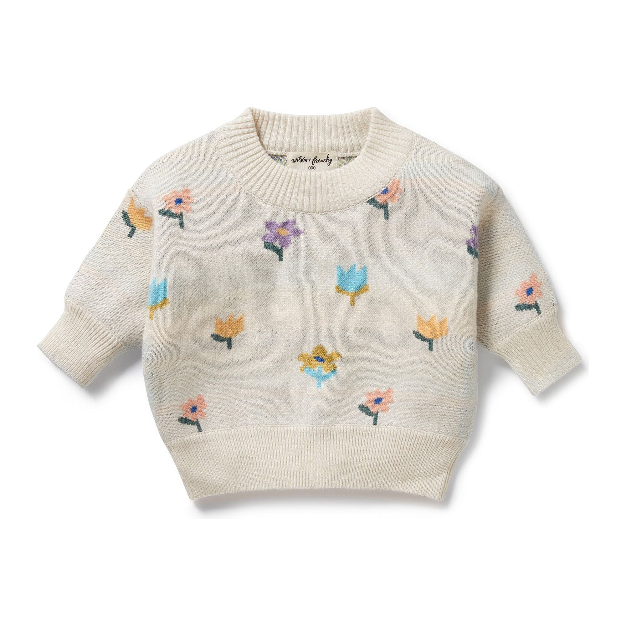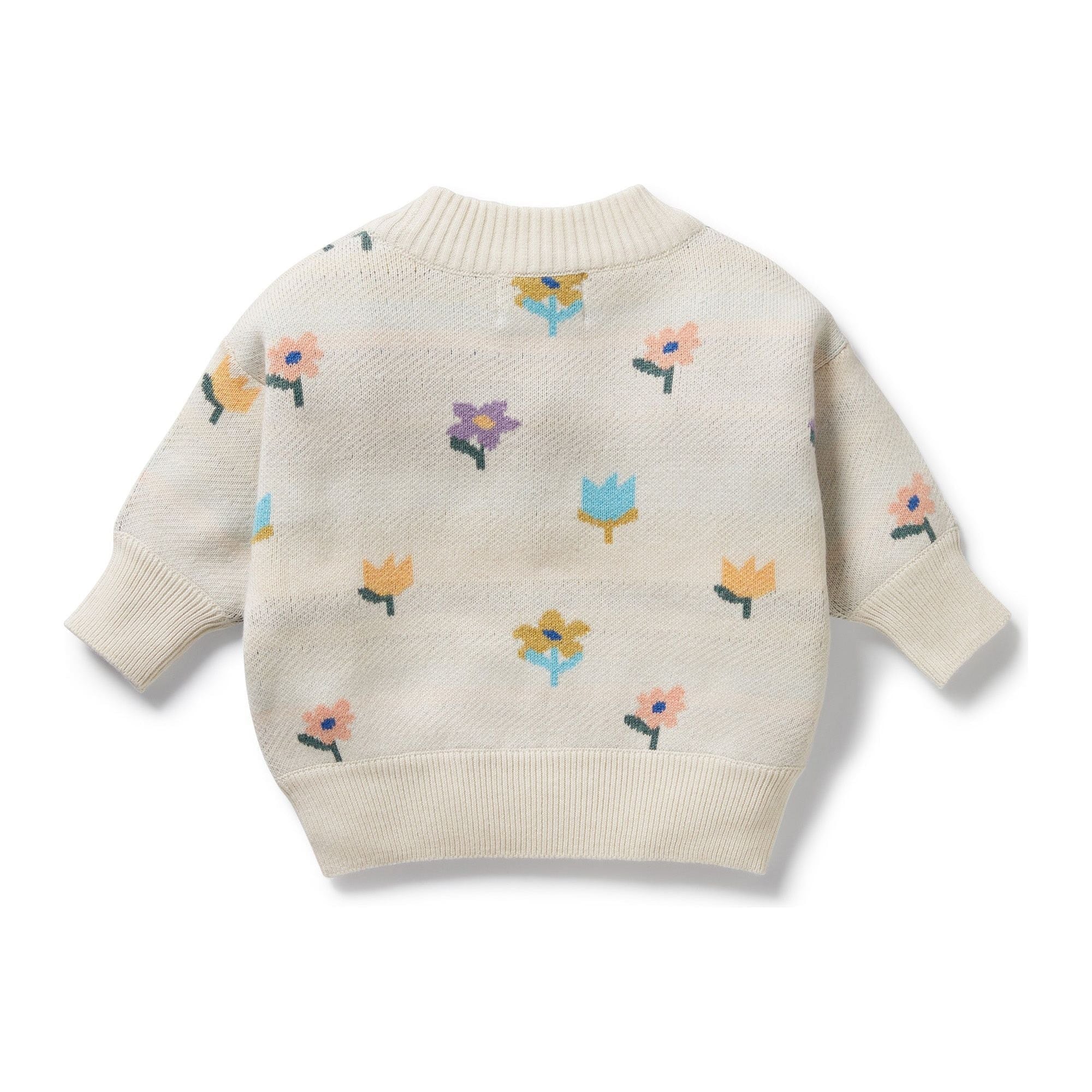 Get ready to cuddle up in style with our organic cotton, wool, and bamboo jacquard knit jumper. The roomy fit and ribbed cuffs and neckline provide comfort, while the cute flower pop design adds some playful charm. Stay warm and trendy, baby and kid approved. Key Features: relaxed fit, long sleeved, all over jacquard design, packaged in a bio-degradable bag. Details: 50% organic cotton, 43% bamboo, 7% wool. Gentle machine wash. Made in India.