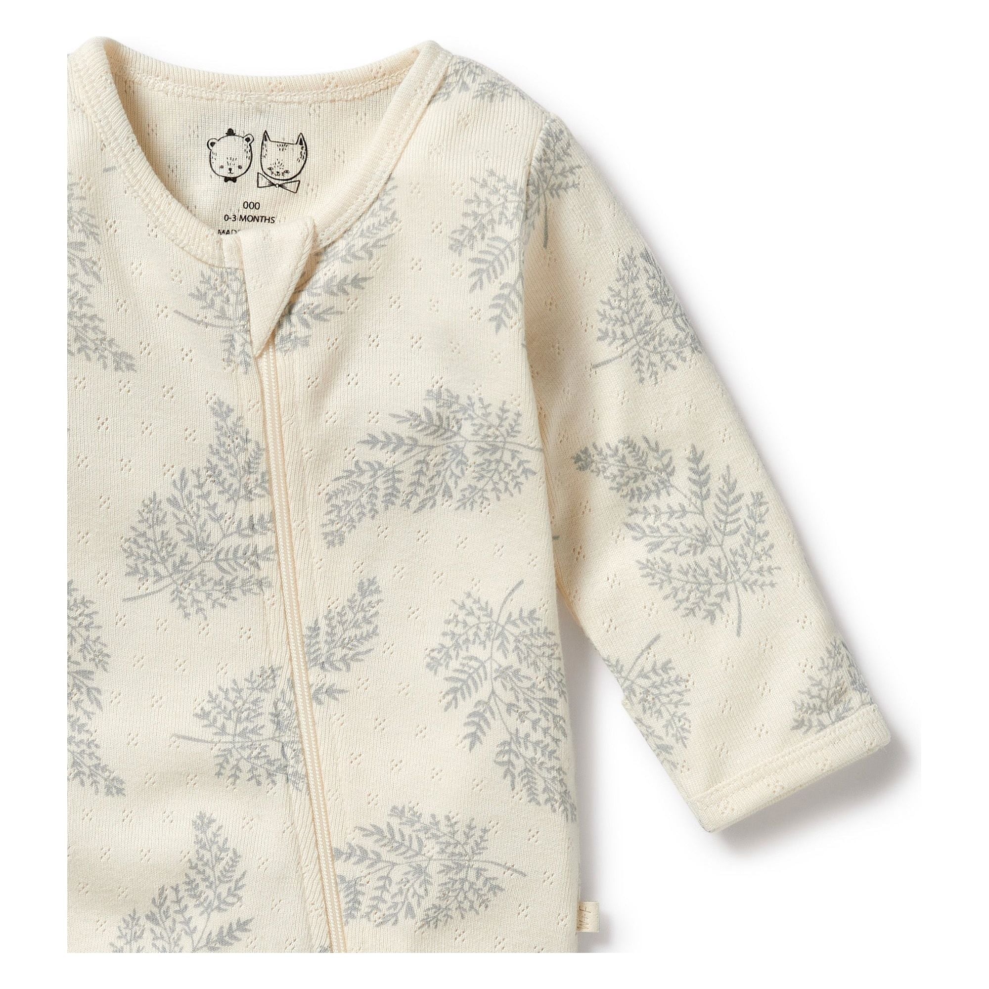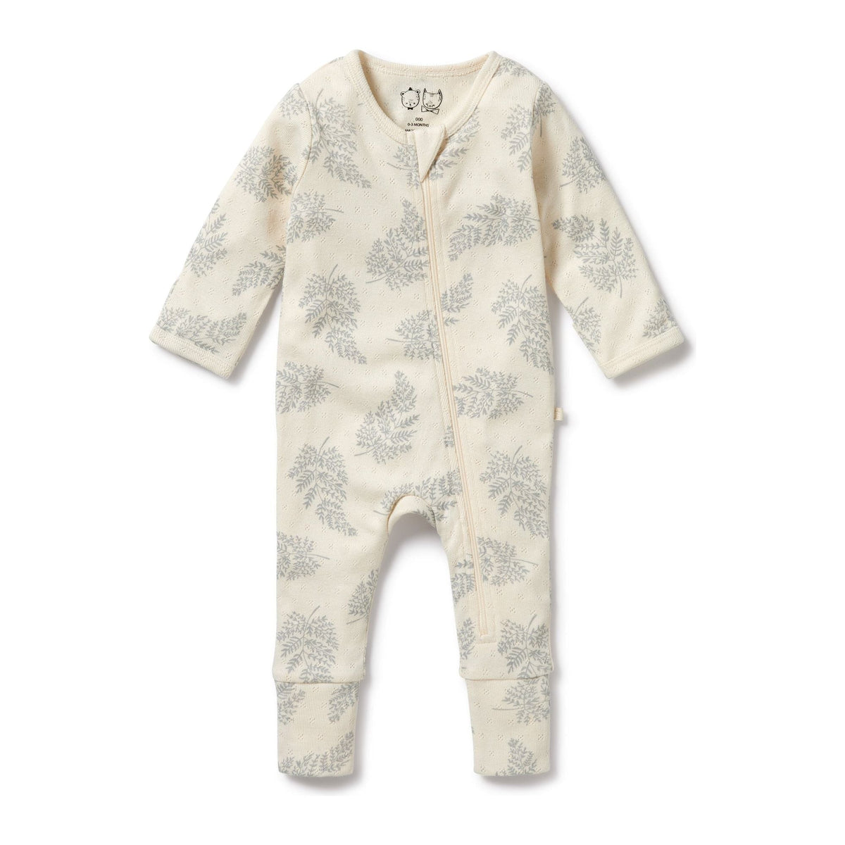 Keep your newborn comfy and cosy with this practical yet adorable Forever Ferns organic pointelle zipsuit with feet. The design features a fold over mitten (sizes newborn + 000) to protect baby's face from little fingernails, and the option of a footed foot for growing bodies. Crafted from GOTS certified organic cotton pointelle, it's gentle on baby's sensitive skin, and extra handy when having to make nappy changes. Features a gorgeous hand-illustrated print.