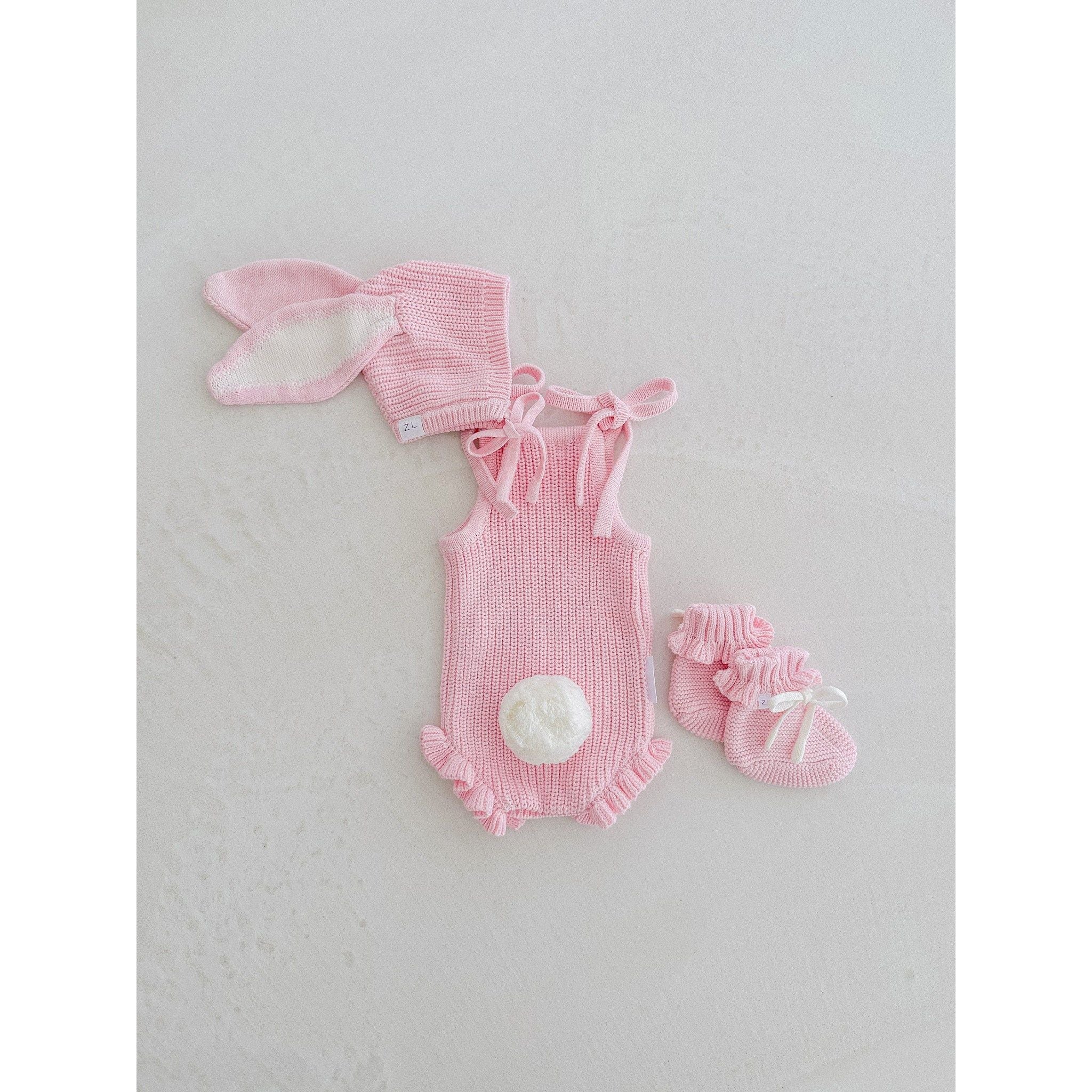 Chunky knit frill bodysuit in our two tone Dahlia colour featuring a removable bunny tail (press snap). Frill leg detail and adjustable ties at shoulder. Press snaps at crotch for easy nappy changes. Match with items from our Dahlia Easter Collection.