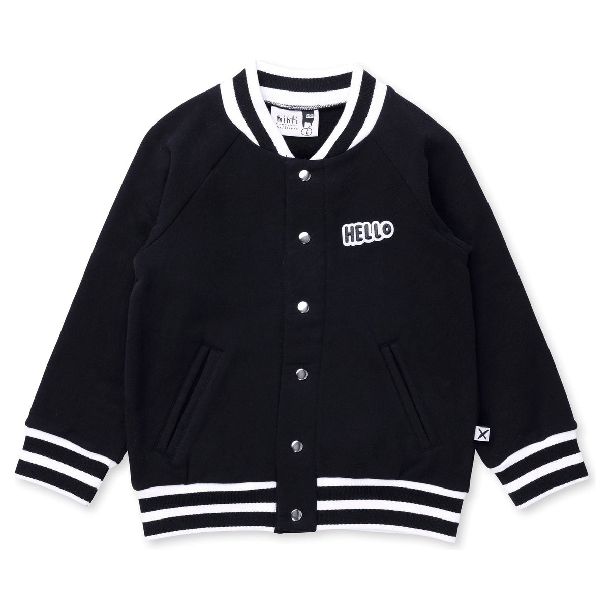 Cosy bomber jacket with metal snap domes, front welt pockets and contrast striped 2x2 rib. 95% Cotton // 5% Elastane.