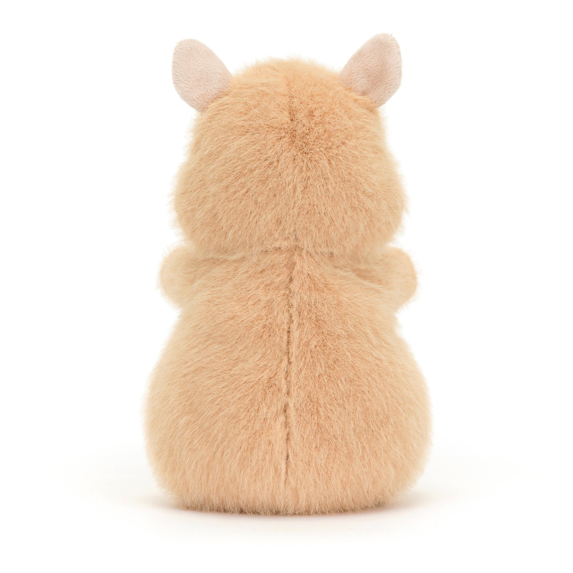 This fuzzy hamster has apricot fur and gently folded peach ears.