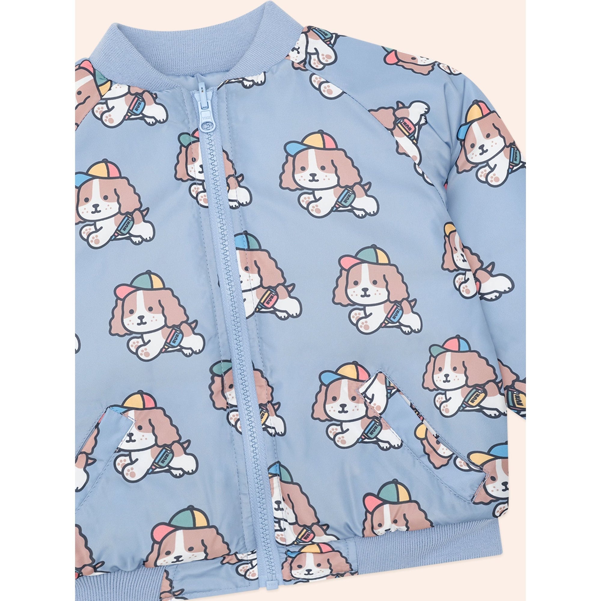 This reversible bomber is two jackets in one. On one side, have fun with our custom happy pup print. On the other, stay cool in soft stone blue. Featuring front pockets and an easy front zip, this versatile piece is consciously crafted from Global Recycled Standard (GRS) recycled polyester and is water repellant on both sides.