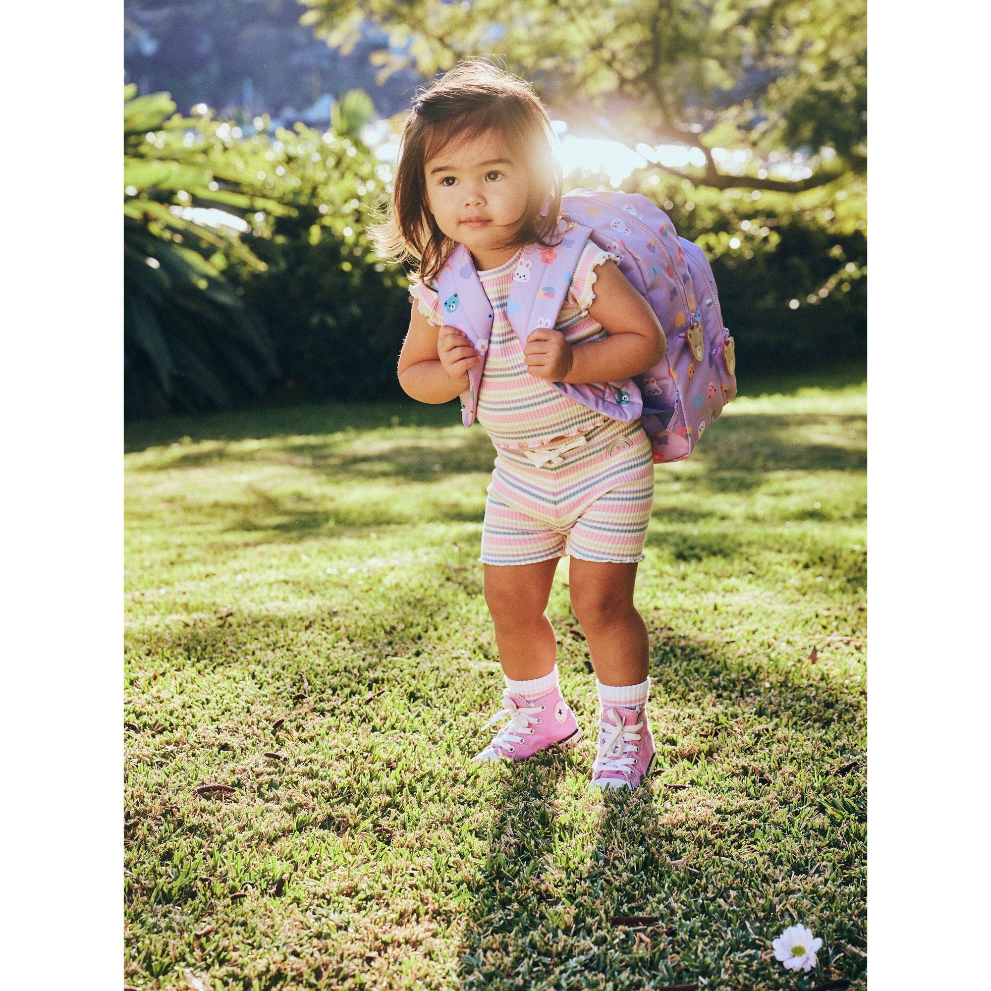 THE perfect backpack for daycare, kindy or backyard expeditions. Made with zip pockets and extra large Huxbear tabs for easy access, an elasticated drink bottle holder for quick sips in between play and adjustable padded straps for comfy wear. Don’t forget the inside pocket, ideal for hiding secret treasure.
