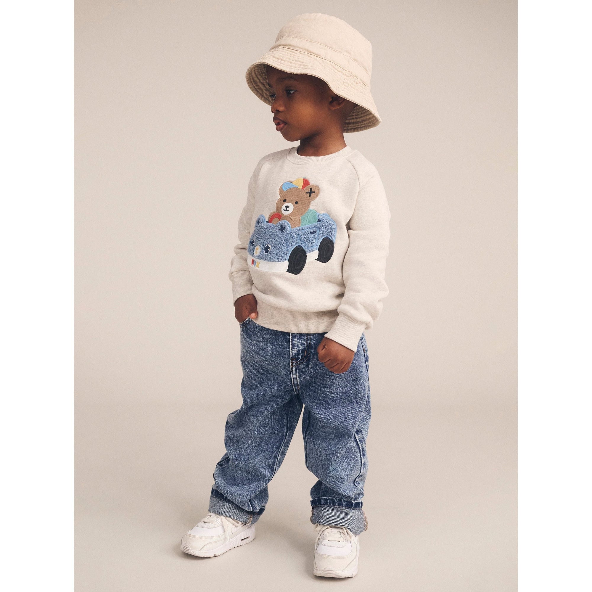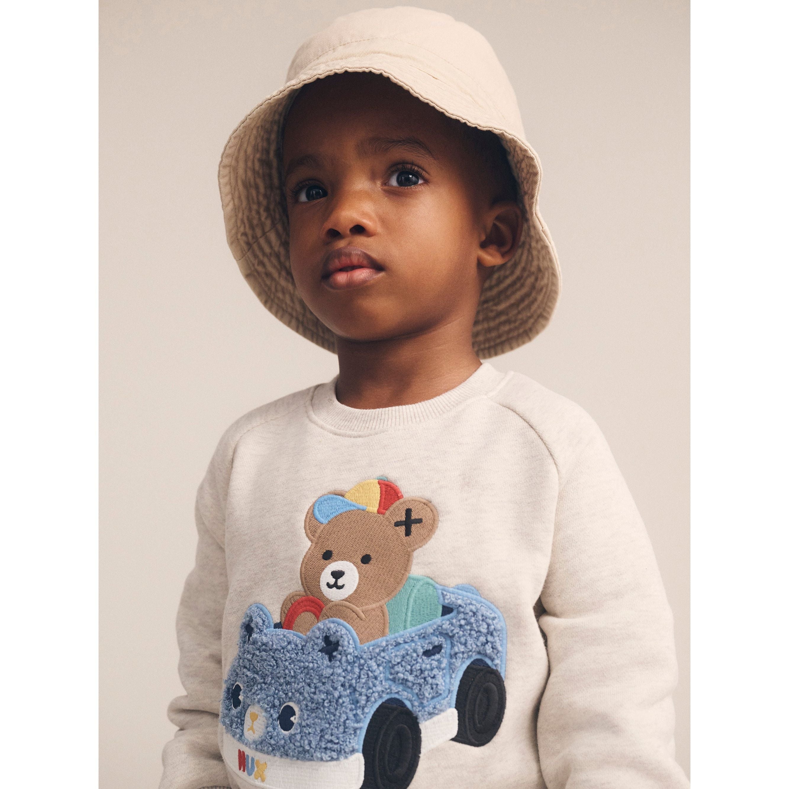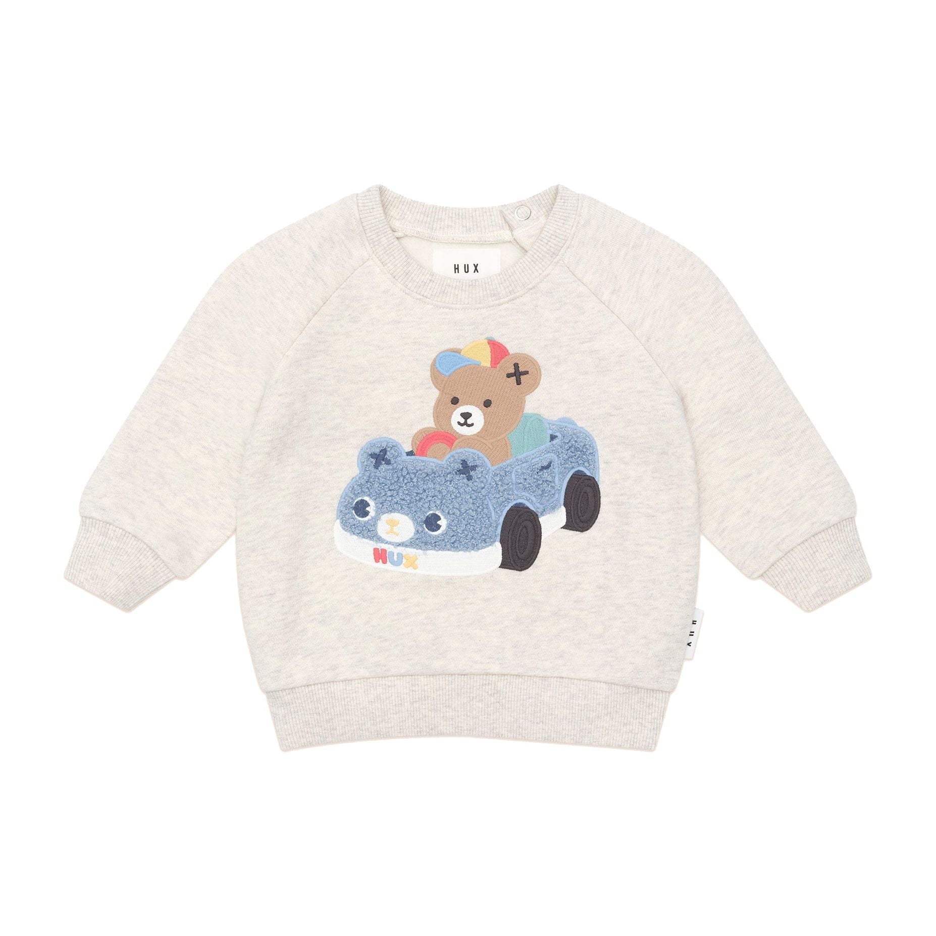 This cosy Huxmobile fleece sweatshirt is made from the dreamiest almond marle organic cotton that feels like getting a big hug from your best friend. It features a tummy-sized fluffy Huxmobile embroidery. Baby sizes include stainless steel back snaps for easy dressing.