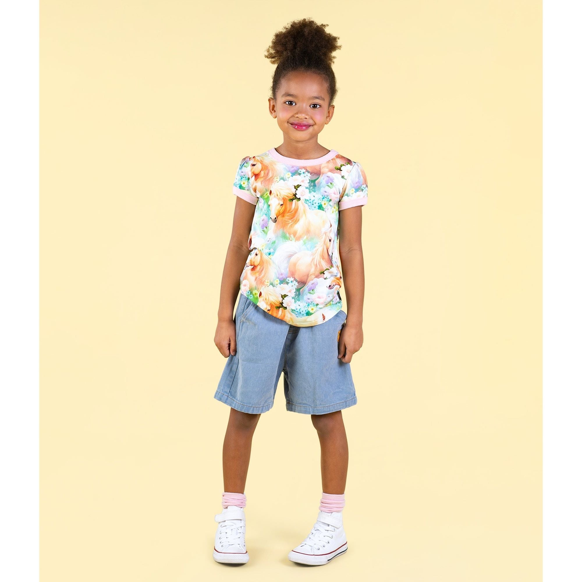 Introducing our Icelandic Ponies T-Shirt! Made from 95% cotton and 5% elastane jersey, this t-shirt features a pattern of flowers and ponies. Fitted with puff short sleeves and pink ribbing across the neck and sleeve hem.