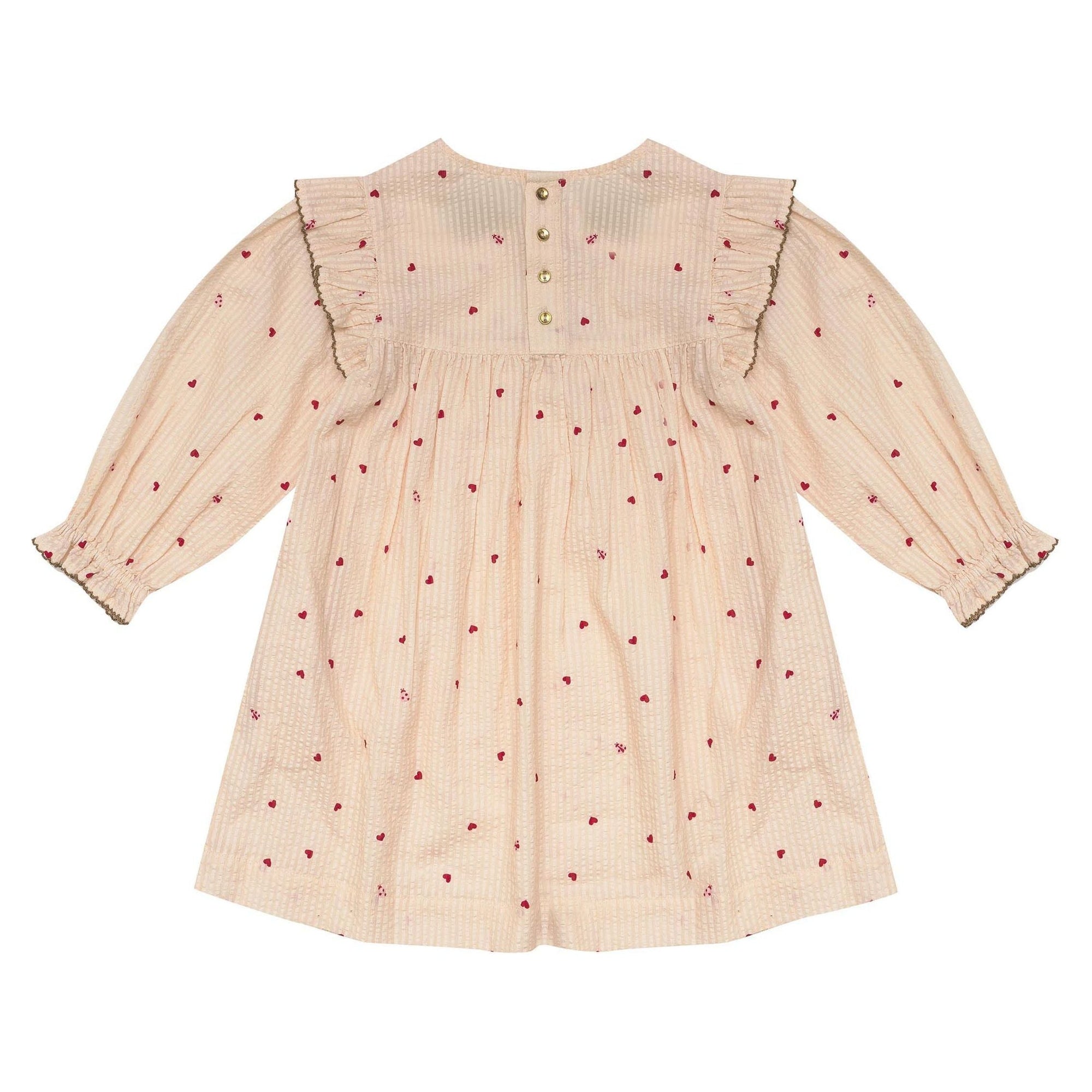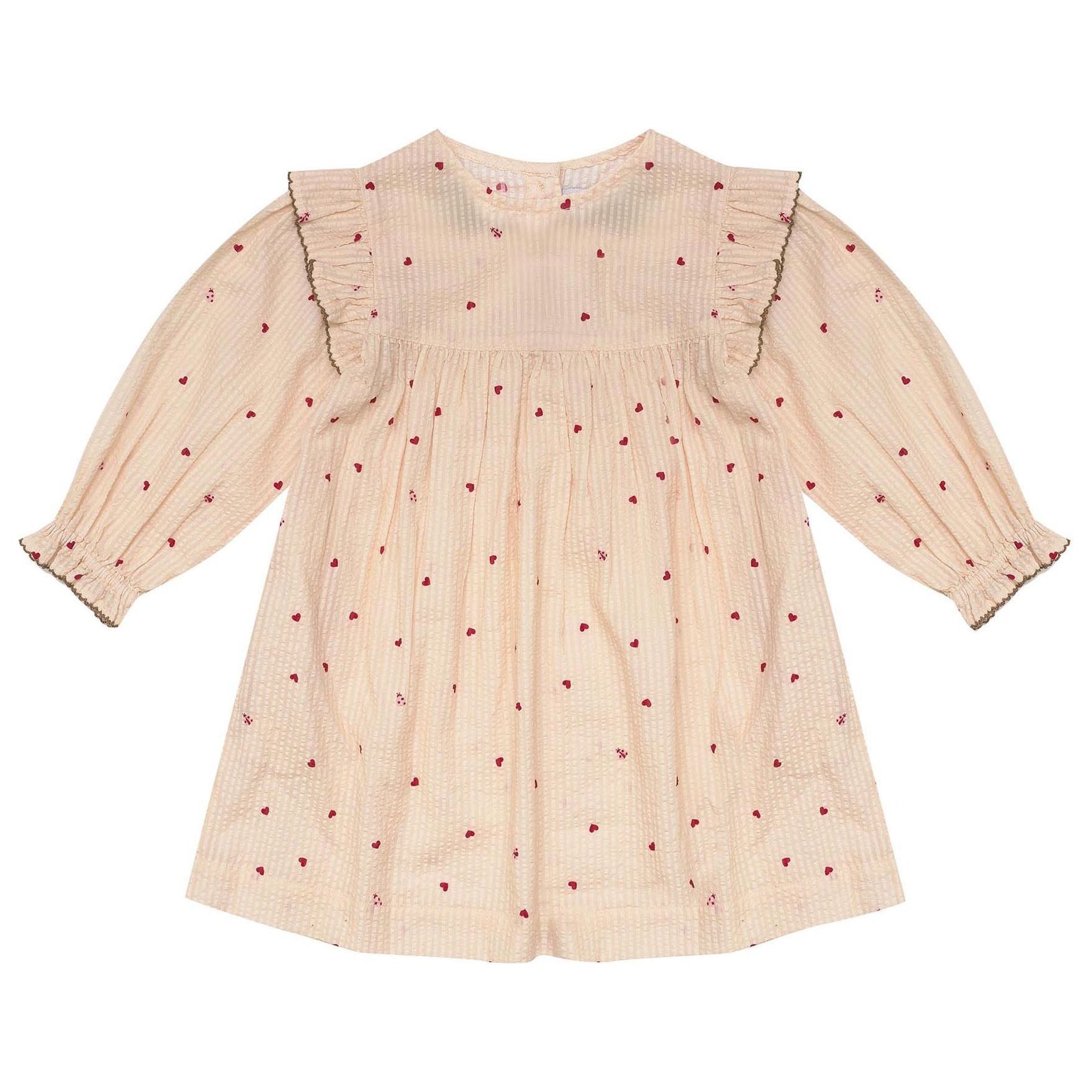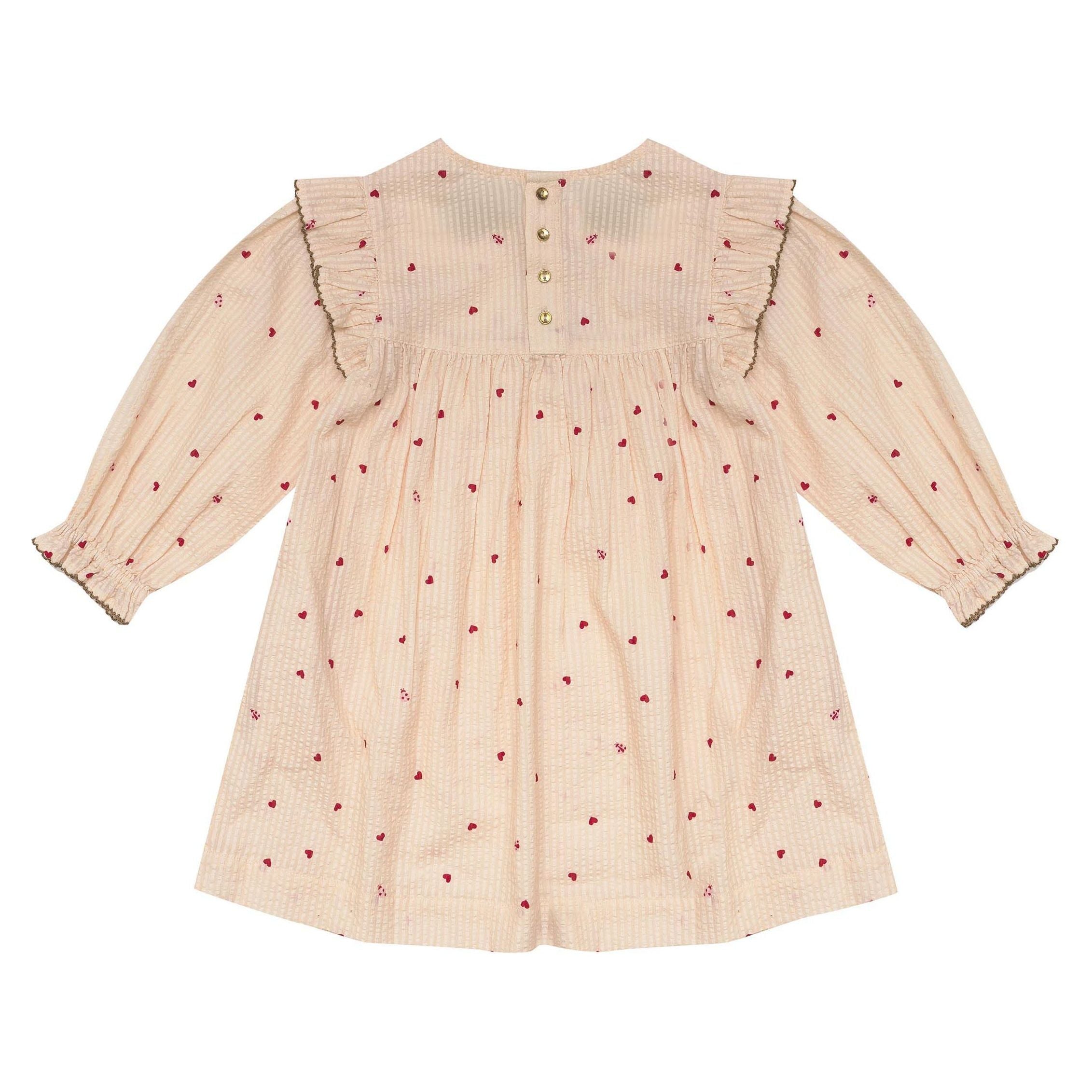 With full sleeves and ruffled edges, this dress boasts our divine "Love Bug" print in soft cotton seersucker.