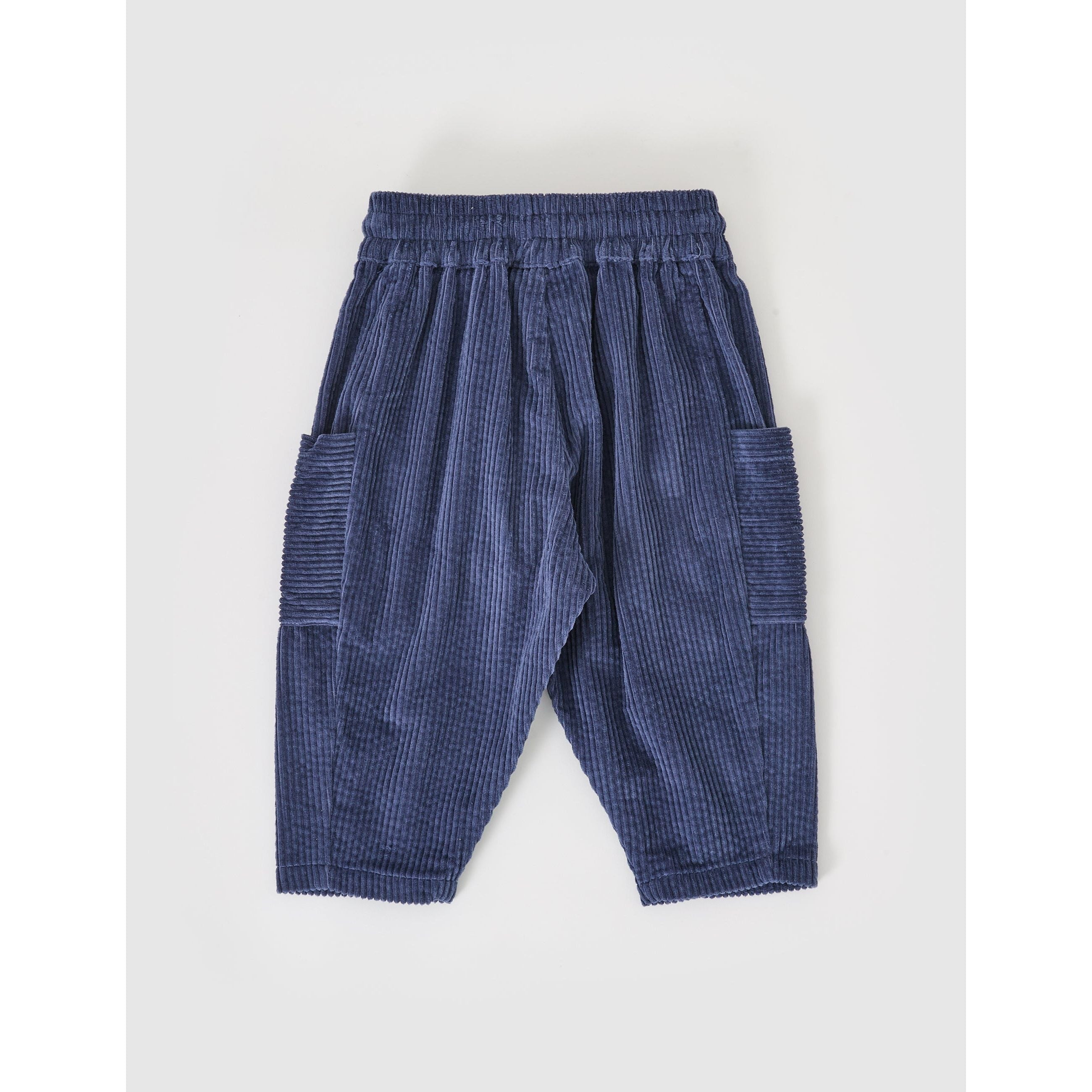 True to size. Relaxed fit, wide leg style that tapers in at the ankle. Features oversized wrap-around pockets for storing treasures, an elasticated waist and functional drawstring. Soft cotton corduroy fabrication.