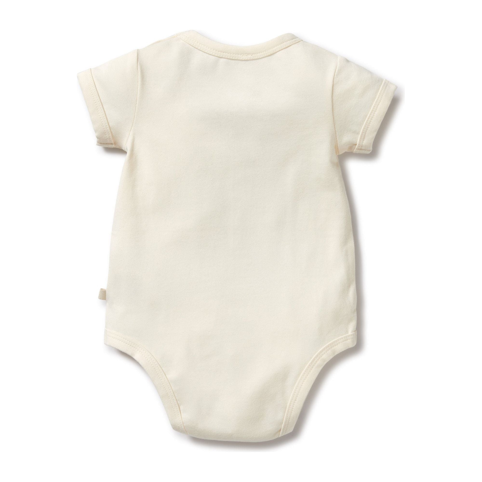 Key Features: Short Sleeved. Side neck opening with mock wood buttons. Snap leg closure for easy changes. Made with GOTS certified organic cotton. Australian owned and designed.