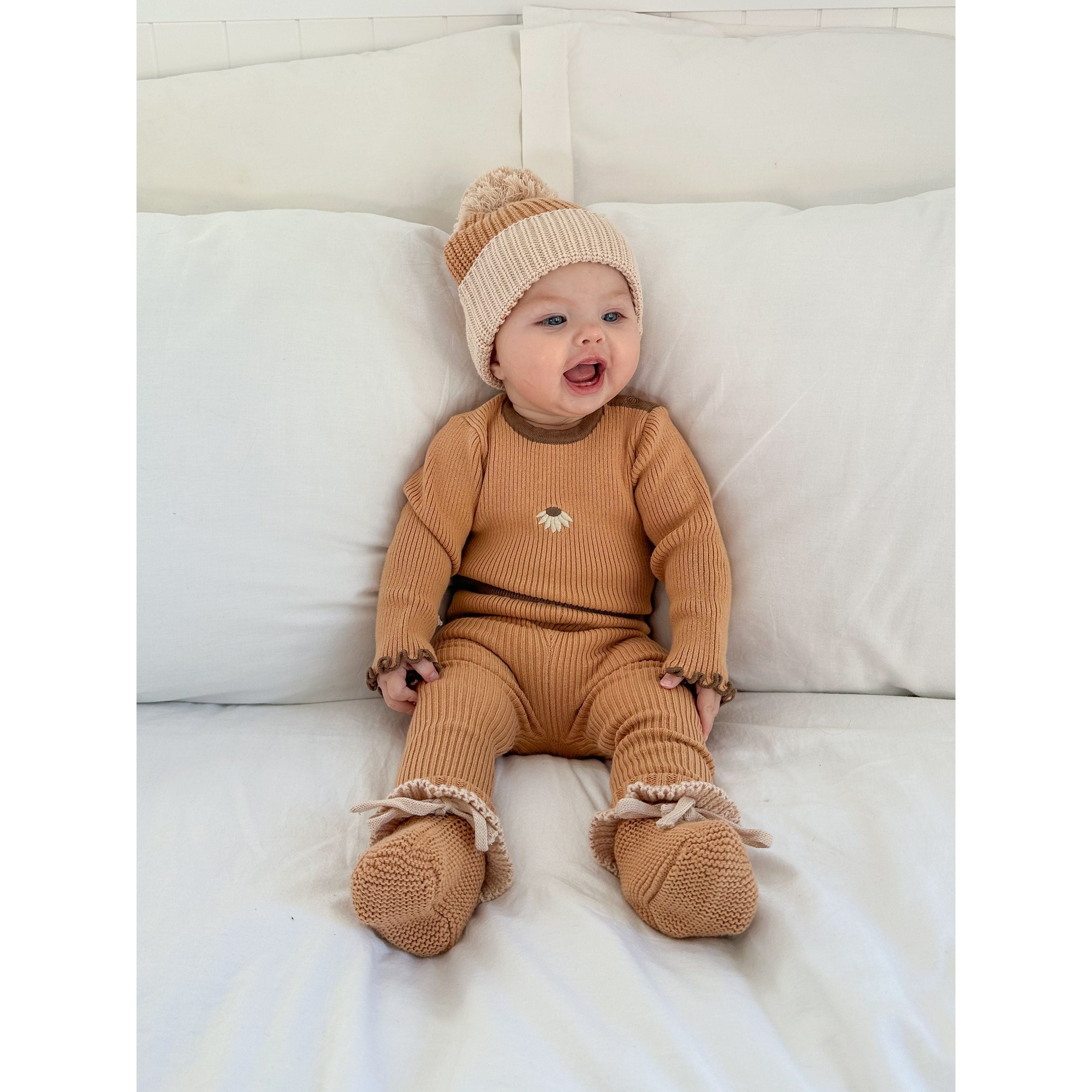 Knitted ribbed leggings in our Dulce colour, featuring an embroidered Hazel flower on each ankle. Mix and match with our Hazel + Cyrus Collections.