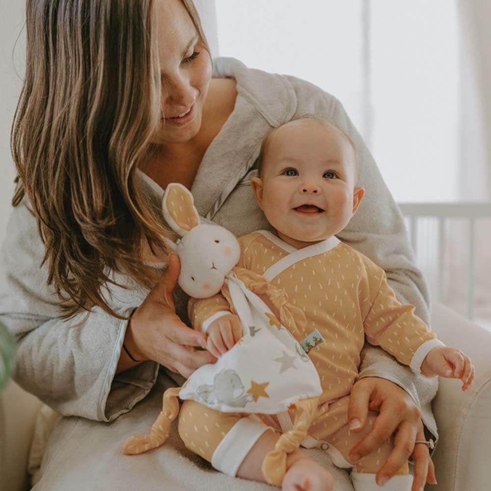 This Little Star teether is super soft and cuddly with a sweet embroidered bunny face. A lovey and pacifier holder in one, their arms and legs are tied in knots for handy chewing and soothing. You can also untie the knots and slip on a pacifier. Multiple textures for soothing and developing babies senses. Machine washable.