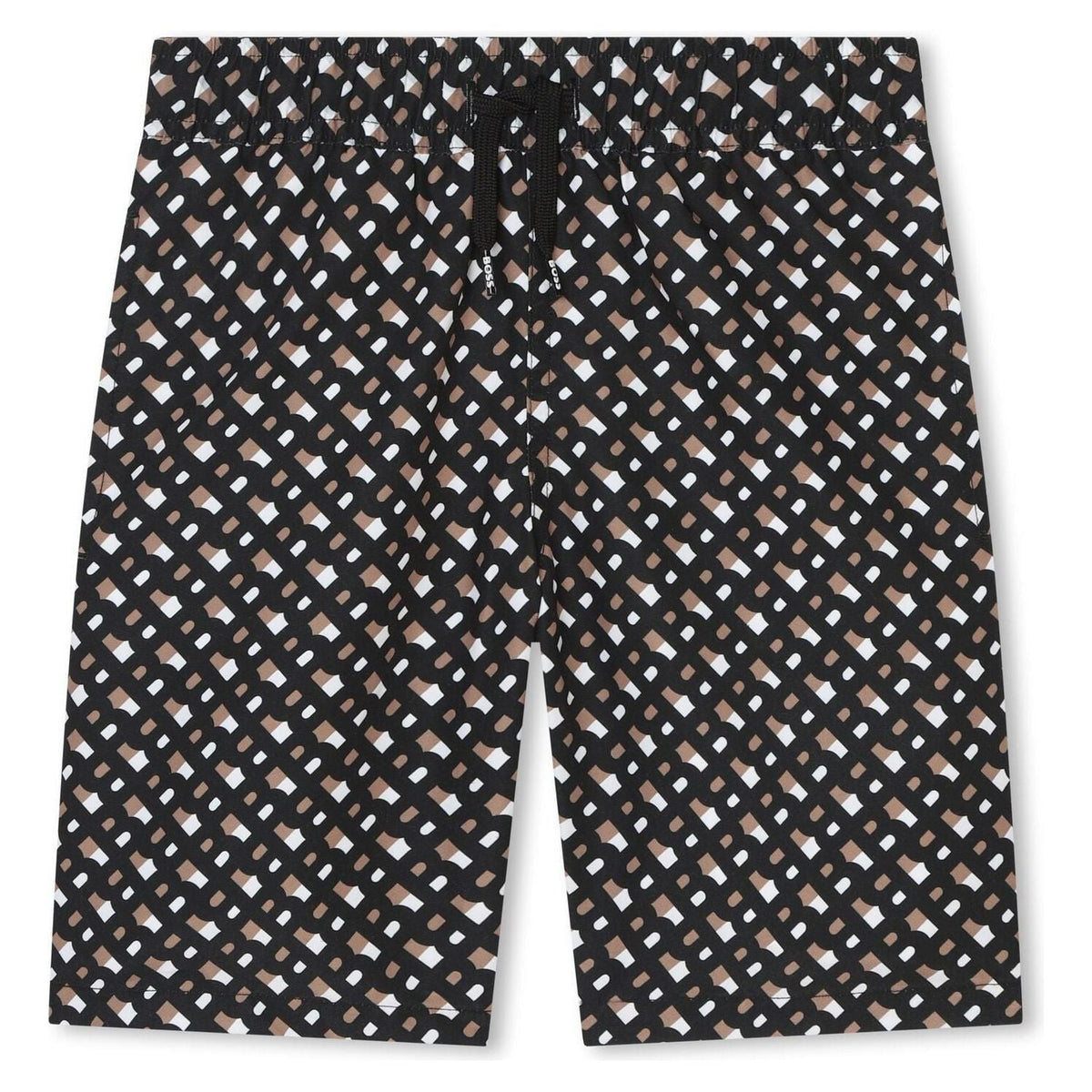Boys black and brown swim shorts by BOSS. Made from a lightweight polyester in the brands signature allover monogram print. They feature an elasticated drawstring waistband and soft mesh lining for a comfortable fit. Finished with side concealed zip pockets.