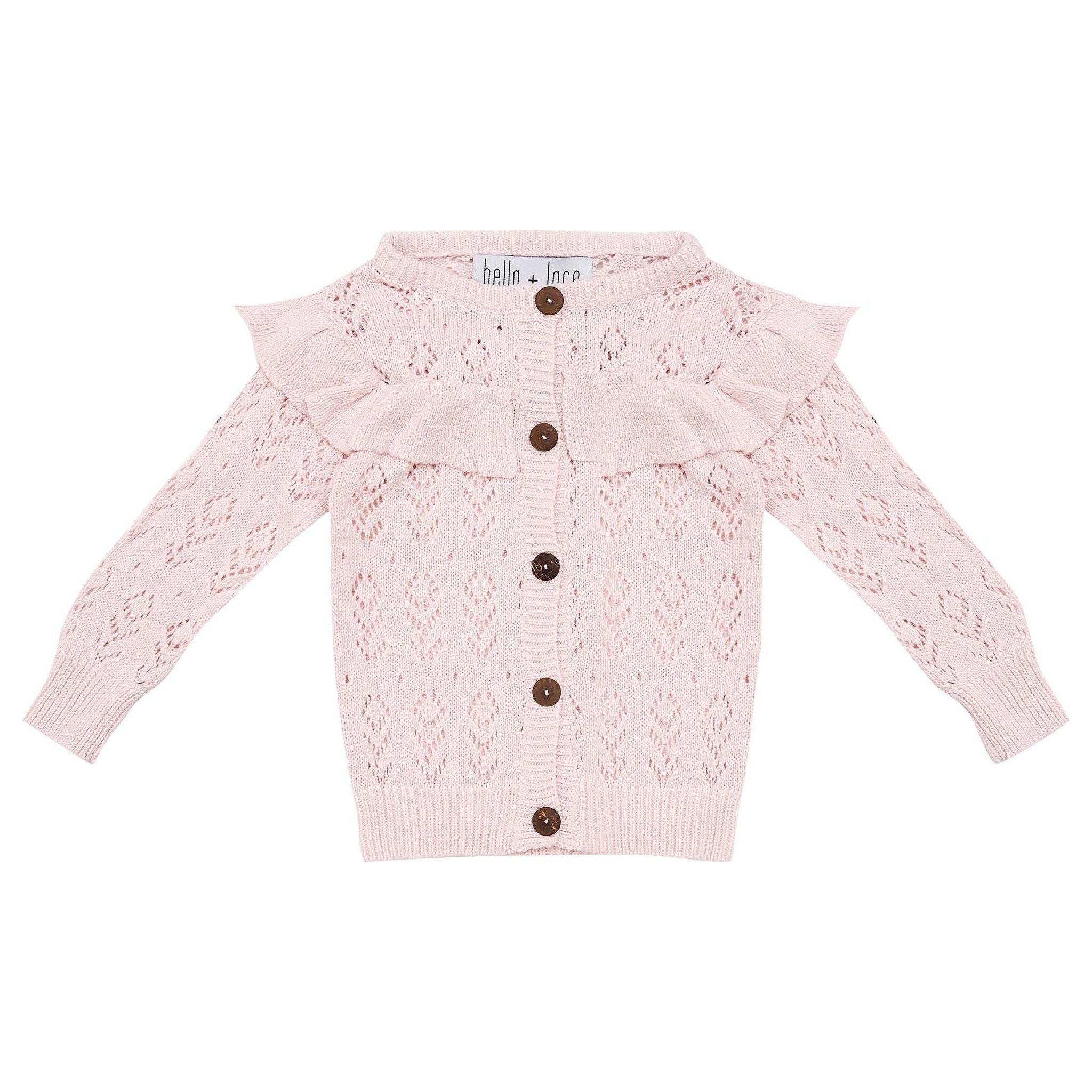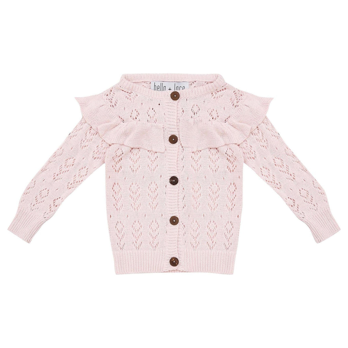 Sweet and pretty, this darling cardi is the cherry on your cupcake. Featuring chevron lace style knit with a peplum shoulder frill, in our softest cotton, perfectly complimented with wooden button font.