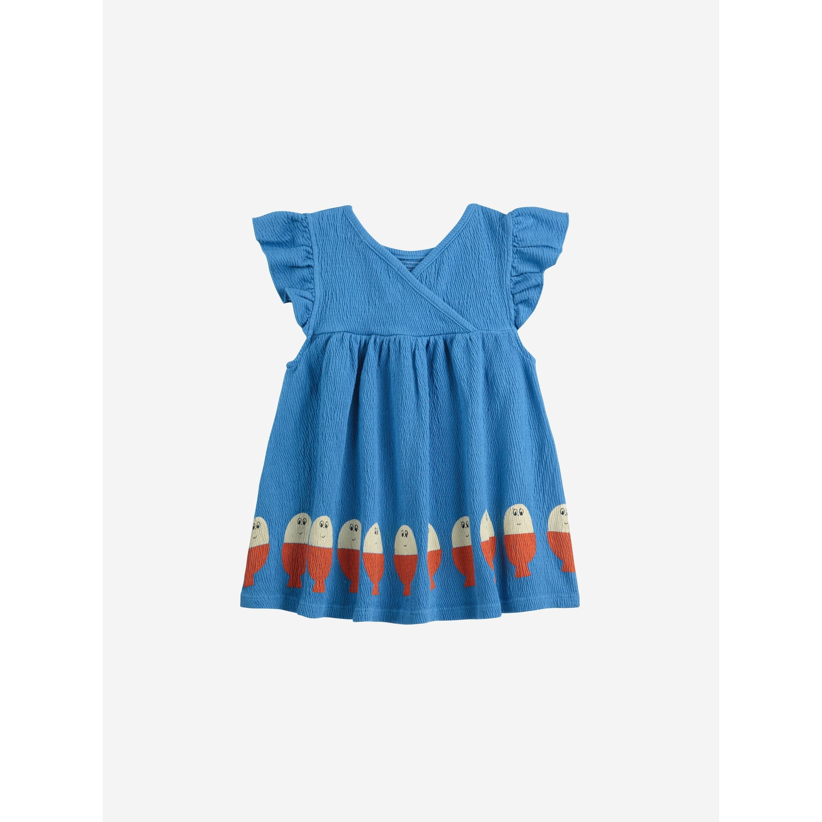 Charming and rustic, this blue dress is tailored for sunny days. Crafted from 96% organic cotton with a touch of polyester and elastane, it features a sleeveless design, gathering details, and embroidery for a playful finish. The evasé fit and rustic fabric are complemented by ruffled accents, creating a standout piece. Responsibly made in Spain.