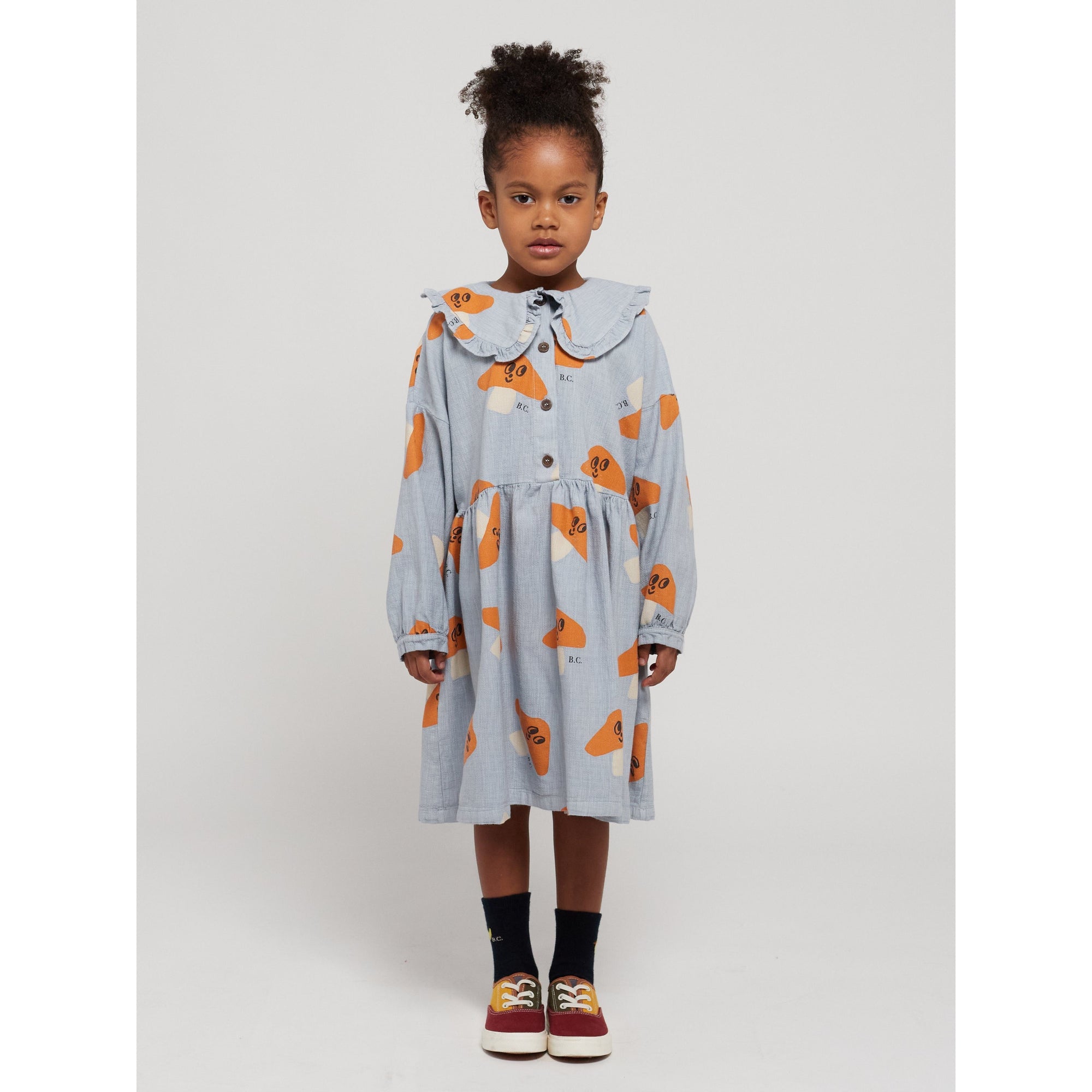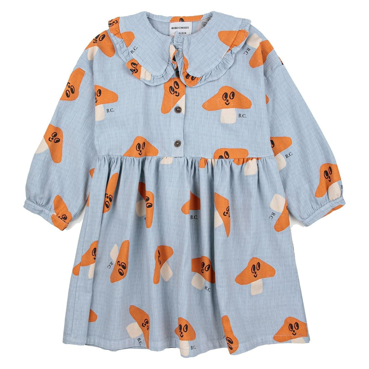 100% cotton light blue long-sleeve dress. Designed with peter pan collar, long sleeves, front button fastening, over knee length and half placket. It has a evasé fit. Made in Spain.