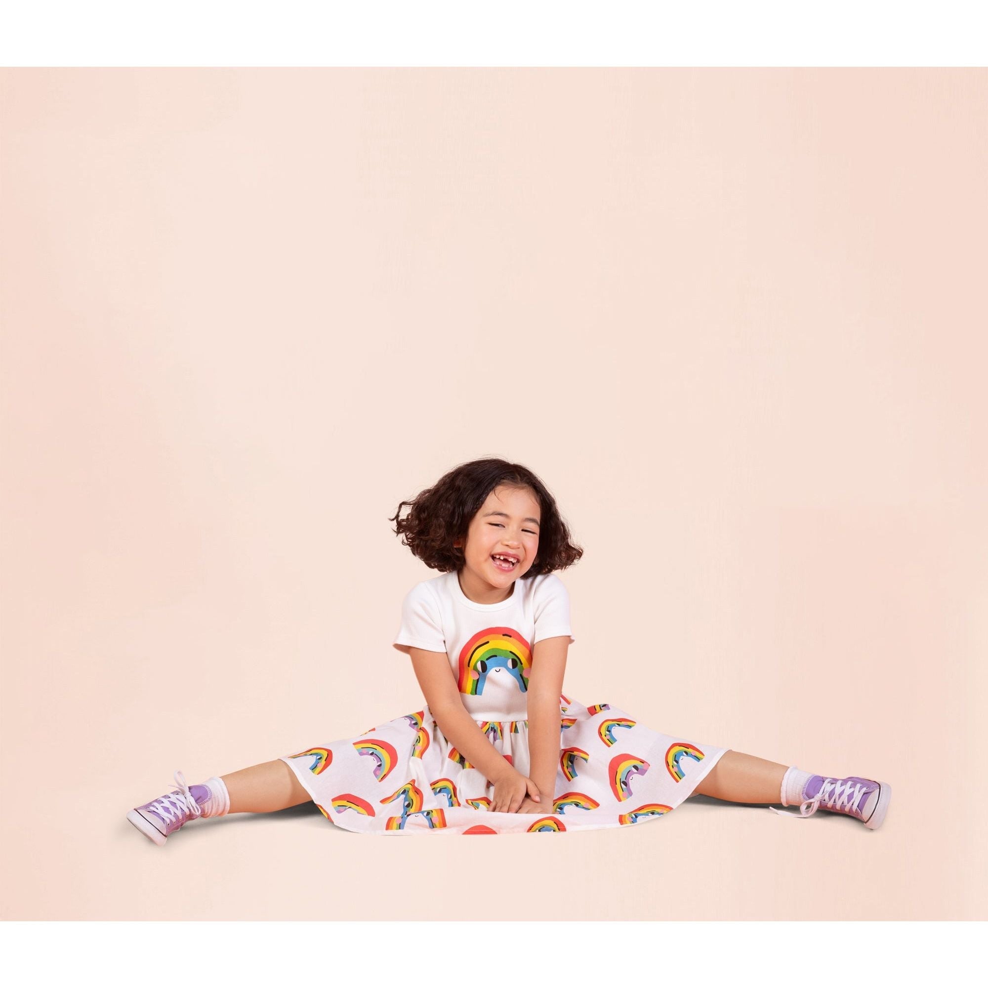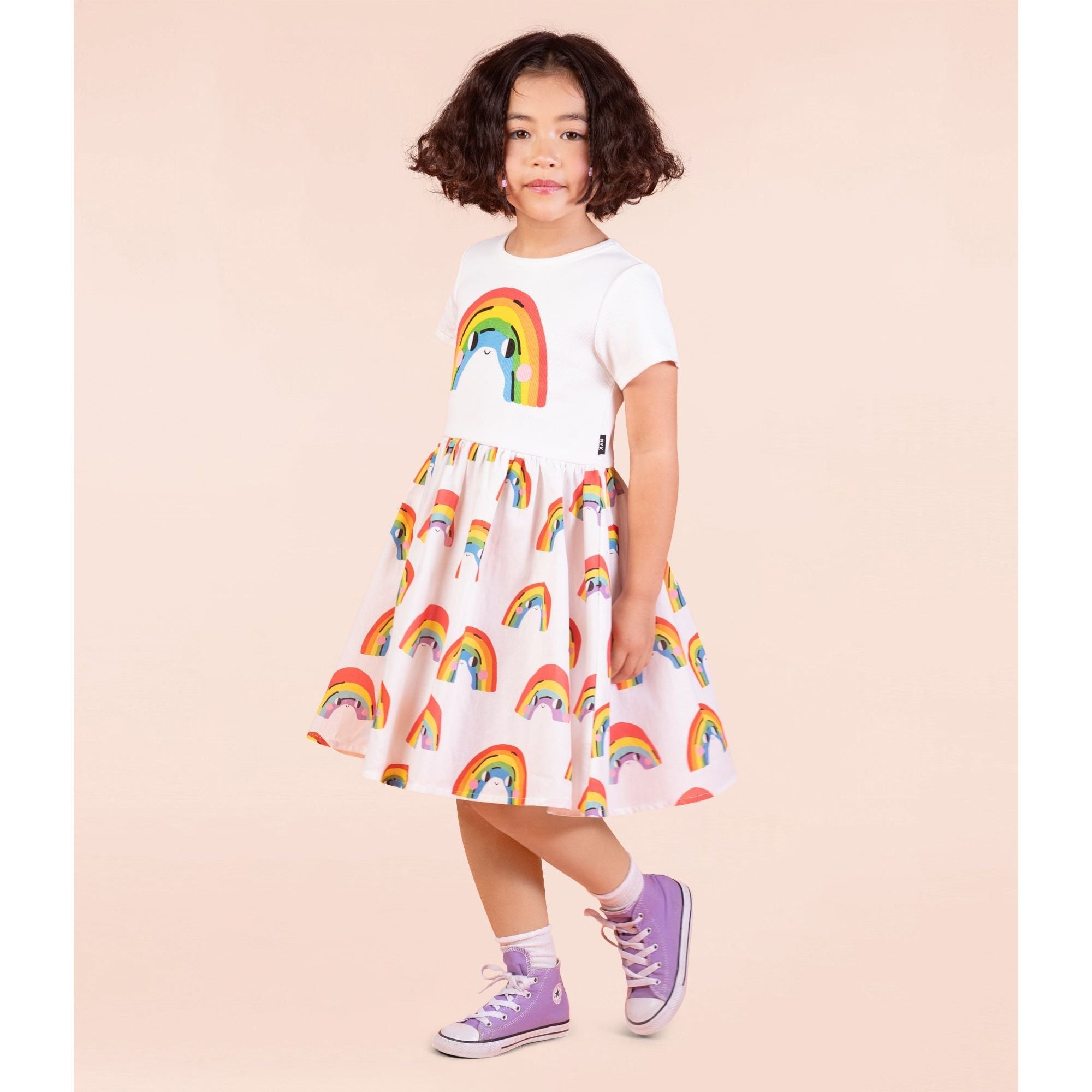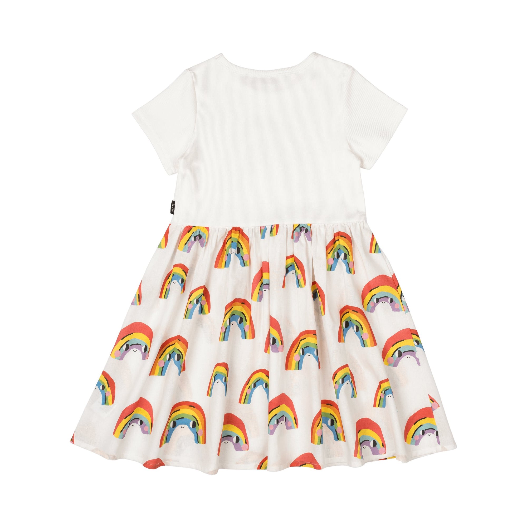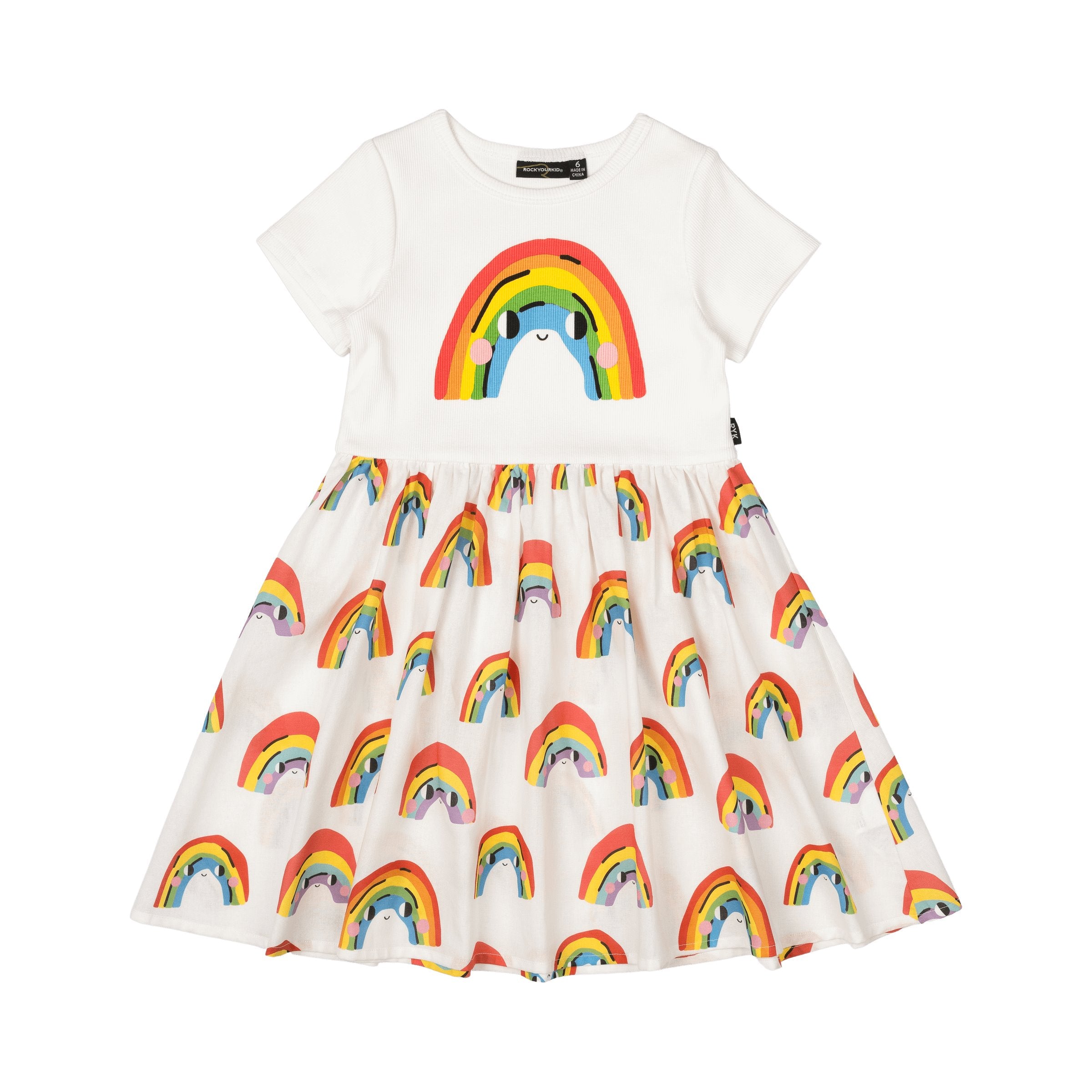 Introducing our Over The Rainbow T-Shirt Dress! Made from 97.8% cotton and 2.2% elastane rib, the cream bodice features short sleeves and a rainbow smiley face print. The skirting is made from 100% woven cotton and features a cream base with a pattern of rainbow smiley faces.