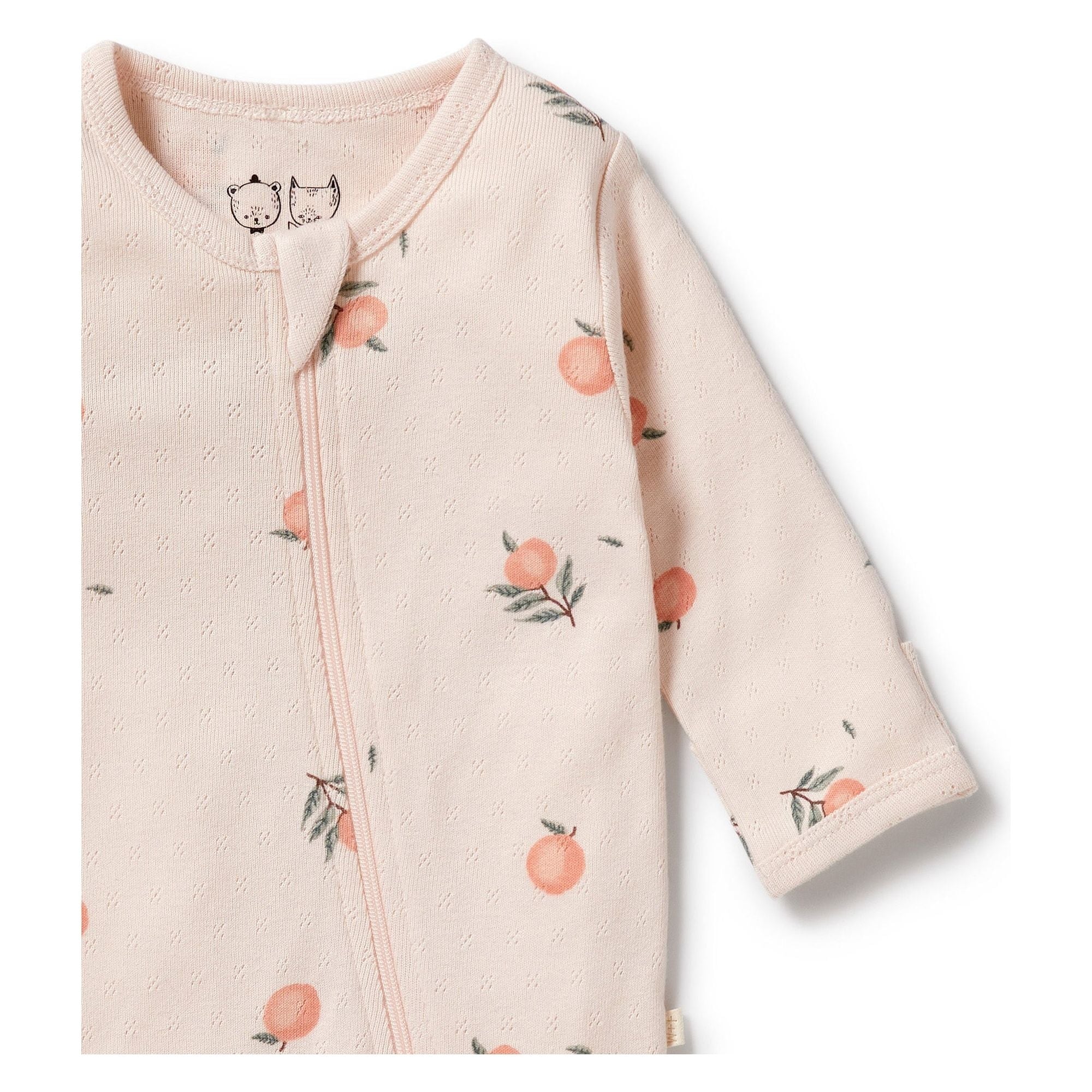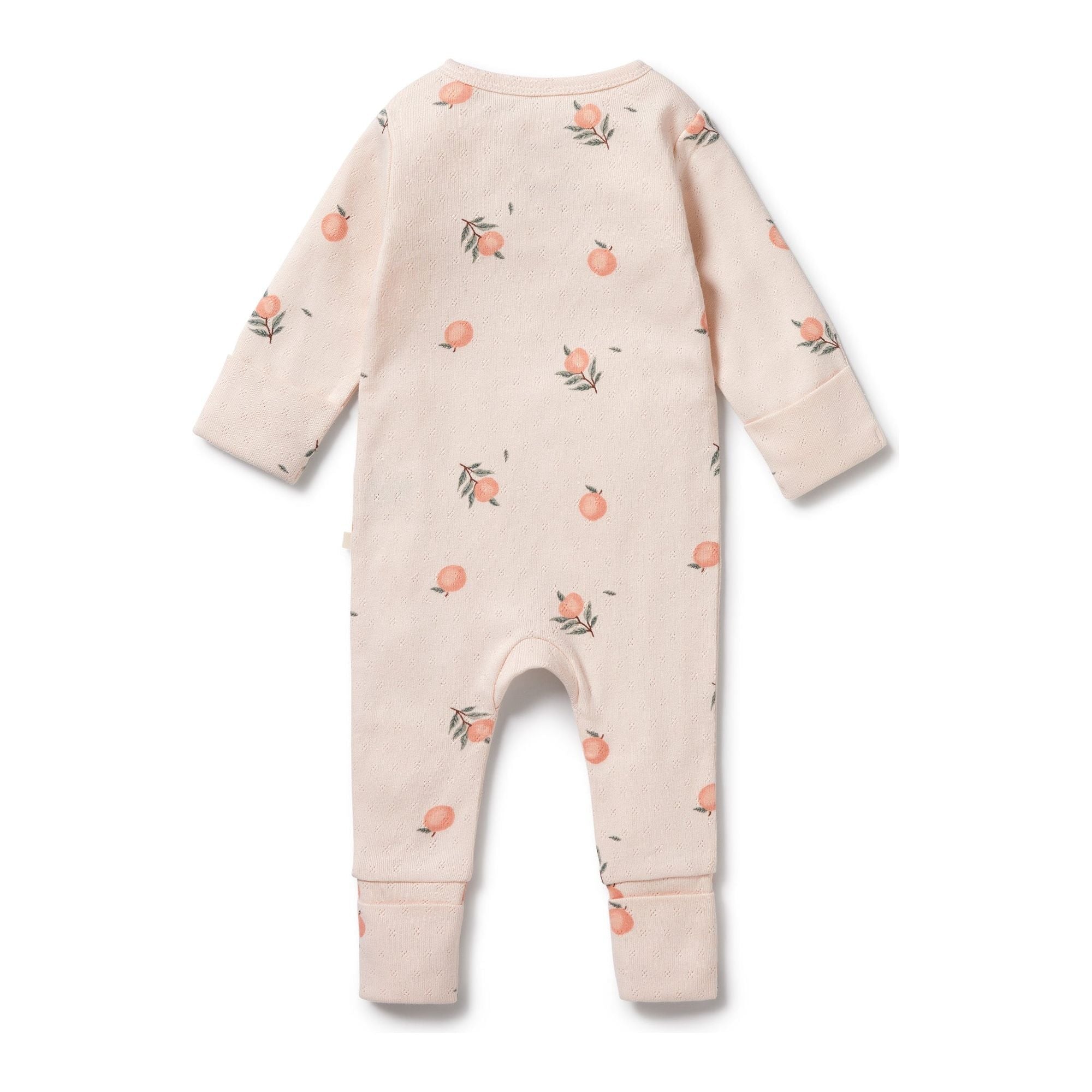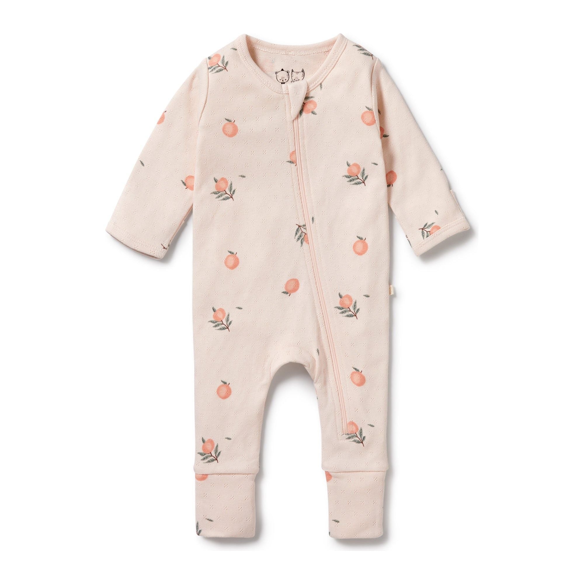 Keep your newborn comfy and cosy with this practical yet adorable Peaches organic pointelle zipsuit with feet. The design features a fold over mitten (sizes newborn + 000) to protect baby's face from little fingernails, and the option of a footed foot for growing bodies. Crafted from GOTS certified organic cotton pointelle, it's gentle on baby's sensitive skin, and extra handy when having to make nappy changes. Features a gorgeous hand-illustrated print.