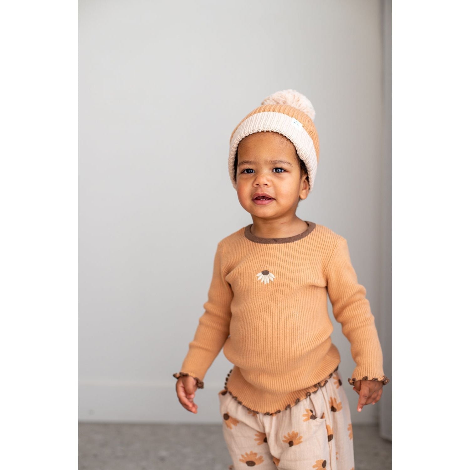Our long sleeve Hazel ribbed top features a small embroidered Hazel flower on the chest, a stretchy ribbed design for a true fit and ruffle cuff and hem. Matching leggings + bodysuit also available. Mix and match with items from our Hazel Collection.